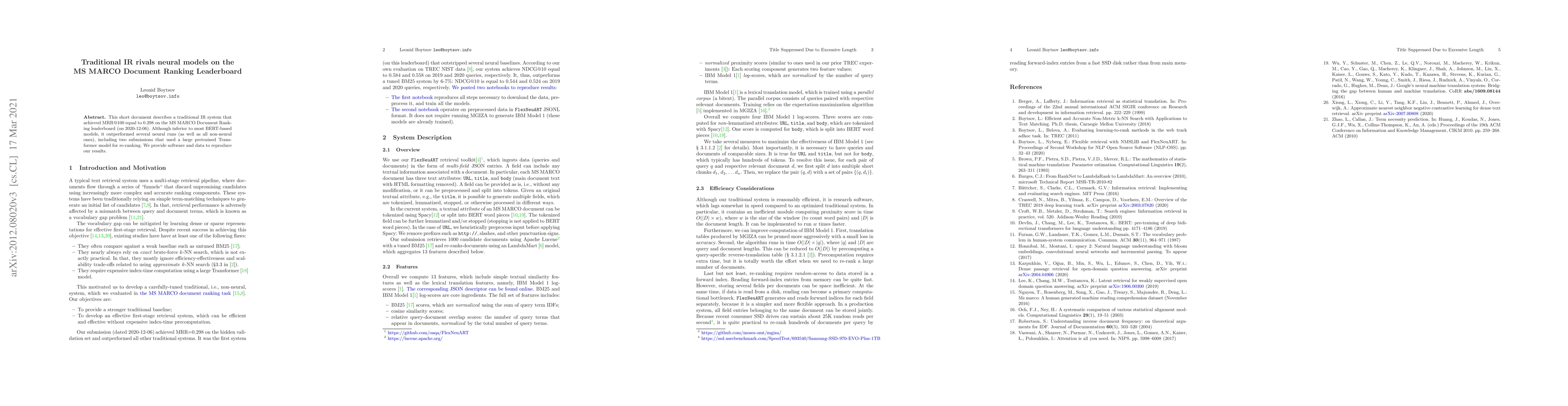 Traditional IR system matches BERT-based models in MS MARCO leaderboard, achieving MRR@100 of 0.298. Despite performance lag behind most neural models, it outperforms several neural and all non-neural submissions.