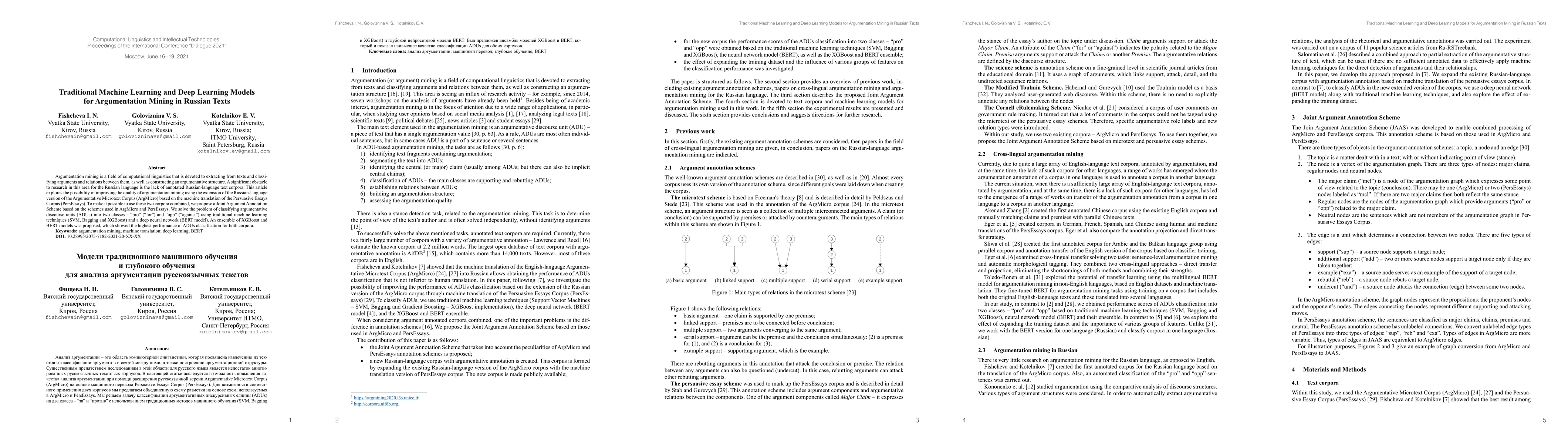 This paper investigates the use of traditional machine learning and deep learning models for argumentation mining in Russian texts, addressing the lack of annotated corpora by extending the Russian-language Argumentative Microtext Corpus. An ensemble of XGBoost and BERT models achieved the highest performance in classifying argumentative discourse units.