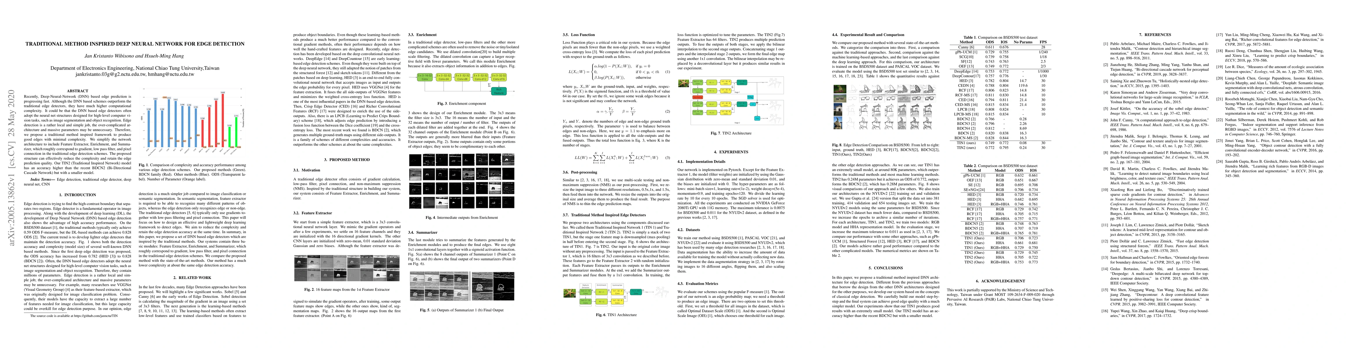 Recently, Deep-Neural-Network (DNN) based edge prediction is progressing fast. Although the DNN based schemes outperform the traditional edge detectors, they have much higher computational complexity. It could be that the DNN based edge detectors often adopt the neural net structures designed for high-level computer vision tasks, such as image segmentation and object recognition. Edge detection is a rather local and simple job, the over-complicated architecture and massive parameters may be unnecessary. Therefore, we propose a traditional method inspired framework to produce good edges with minimal complexity. We simplify the network architecture to include Feature Extractor, Enrichment, and Summarizer, which roughly correspond to gradient, low pass filter, and pixel connection in the traditional edge detection schemes. The proposed structure can effectively reduce the complexity and retain the edge prediction quality. Our TIN2 (Traditional Inspired Network) model has an accuracy higher than the recent BDCN2 (Bi-Directional Cascade Network) but with a smaller model.