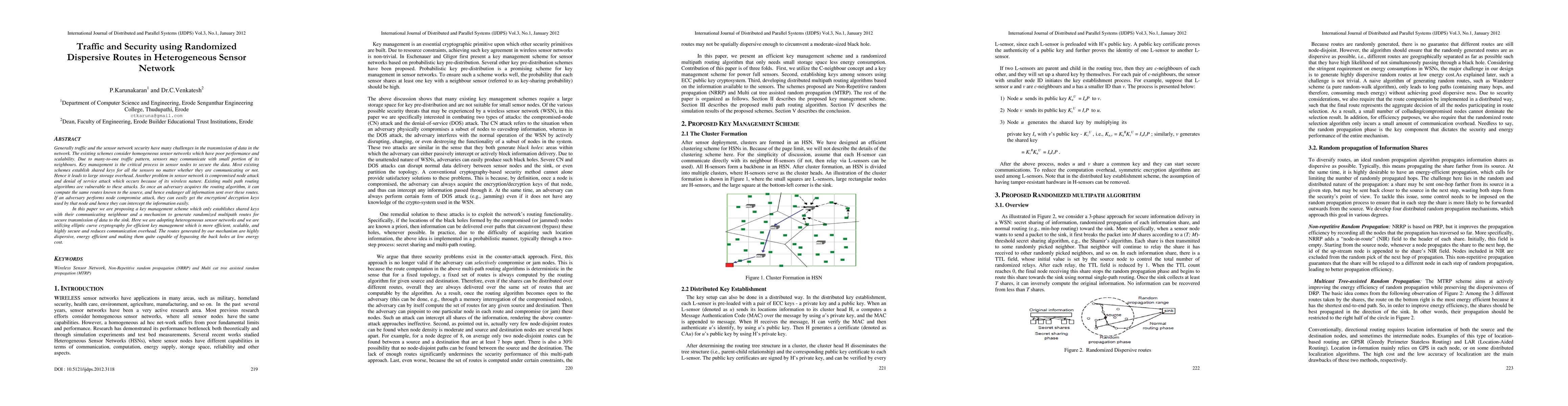 Generally traffic and the sensor network security have many challenges in the transmission of data in the network. The existing schemes consider homogeneous sensor networks which have poor performance and scalability. Due to many-to-one traffic pattern, sensors may communicate with small portion of its neighbours. Key management is the critical process in sensor nodes to secure the data. Most existing schemes establish shared keys for all the sensors no matter whether they are communicating or not. Hence it leads to large storage overhead. Another problem in sensor network is compromised node attack and denial of service attack which occurs because of its wireless nature. Existing multi path routing algorithms are vulnerable to these attacks. So once an adversary acquires the routing algorithm, it can compute the same routes known to the source, and hence endanger all information sent over these routes. If an adversary performs node compromise attack, they can easily get the encryption/ decryption keys used by that node and hence they can intercept the information easily. In this paper we are proposing a key management scheme which only establishes shared keys with their communicating neighbour and a mechanism to generate randomized multipath routes for secure transmission of data to the sink. Here we are adopting heterogeneous sensor networks and we are utilizing elliptic curve cryptography for efficient key management which is more efficient, scalable, and highly secure and reduces communication overhead. The routes generated by our mechanism are highly dispersive, energy efficient and making them quite capable of bypassing the back holes at low energy cost.