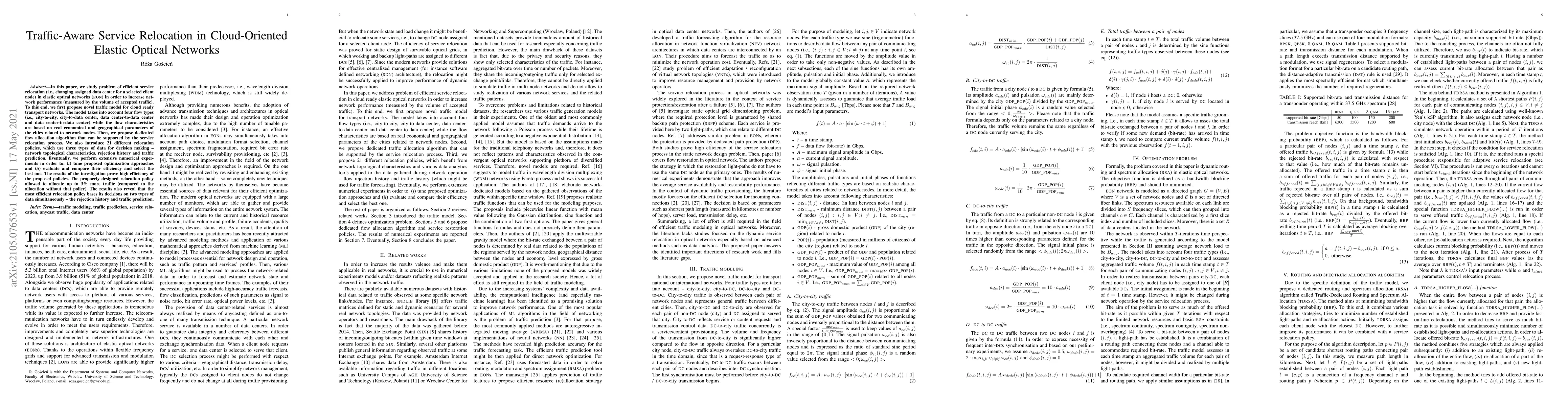 In this paper, we study problem of efficient service relocation (i.e., changing assigned data center for a selected client node) in elastic optical networks (EONs) in order to increase network performance (measured by the volume of accepted traffic). To this end, we first propose novel traffic model for cloud ready transport networks. The model takes into account four flow types (i.e., city-to-city, city-to-data center, data center-to-data center and data center-to-data center) while the flow characteristics are based on real economical and geographical parameters of the cities related to network nodes. Then, we propose dedicated flow allocation algorithm that can be supported by the service relocation process. We also introduce 21 different relocation policies, which use three types of data for decision making - network topological characteristics, rejection history and traffic prediction. Eventually, we perform extensive numerical experiments in order to: (i) tune proposed optimization approaches and (ii) evaluate and compare their efficiency and select the best one. The results of the investigation prove high efficiency of the proposed policies. The propoerly designed relocation policy allowed to allocate up to 3% more traffic (compared to the allocation without that policy). The results also reveal that the most efficient relocation policy bases its decisions on two types of data simultaneously - the rejection history and traffic prediction.