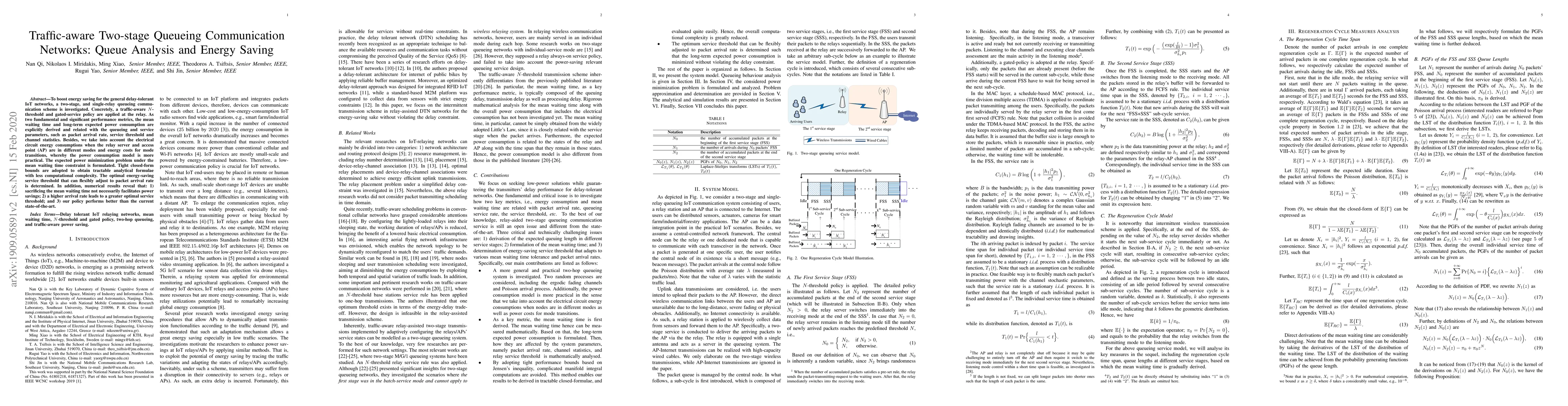 To boost energy saving for the general delay-tolerant IoT networks, a two-stage and single-relay queueing communication scheme is investigated. Concretely, a traffic-aware $N$-threshold and gated-service policy are applied at the relay. As two fundamental and significant performance metrics, the mean waiting time and long-term expected power consumption are explicitly derived and related with the queueing and service parameters, such as packet arrival rate, service threshold and channel statistics. Besides, we take into account the electrical circuit energy consumptions when the relay server and access point (AP) are in different modes and energy costs for mode transitions, whereby the power consumption model is more practical. The expected power minimization problem under the mean waiting time constraint is formulated. Tight closed-form bounds are adopted to obtain tractable analytical formulae with less computational complexity. The optimal energy-saving service threshold that can flexibly adjust to packet arrival rate is determined. In addition, numerical results reveal that: 1) sacrificing the mean waiting time not necessarily facilitates power savings; 2) a higher arrival rate leads to a greater optimal service threshold; and 3) our policy performs better than the current state-of-the-art.