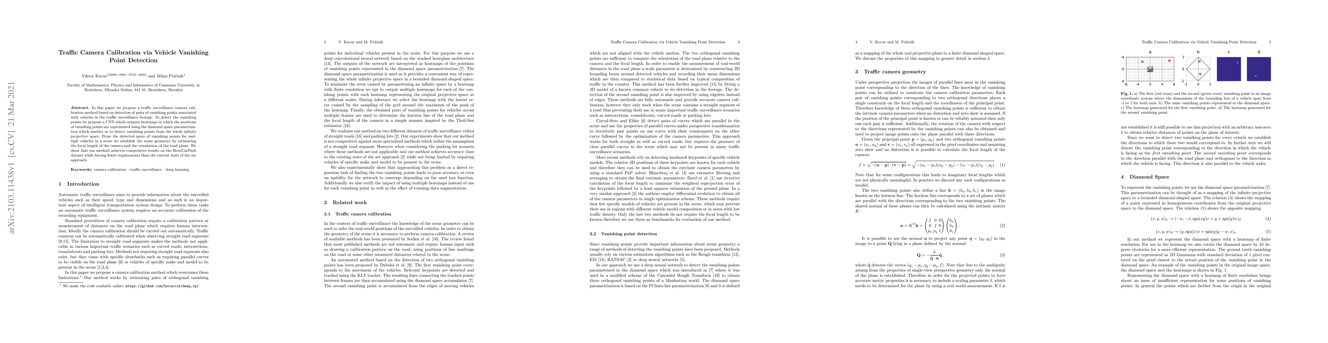 This paper proposes a camera calibration method for traffic surveillance using a CNN to detect vanishing points from vehicles, enabling estimation of camera focal length and road plane orientation. The method achieves competitive results on the BrnoCarPark dataset with fewer requirements than existing approaches.