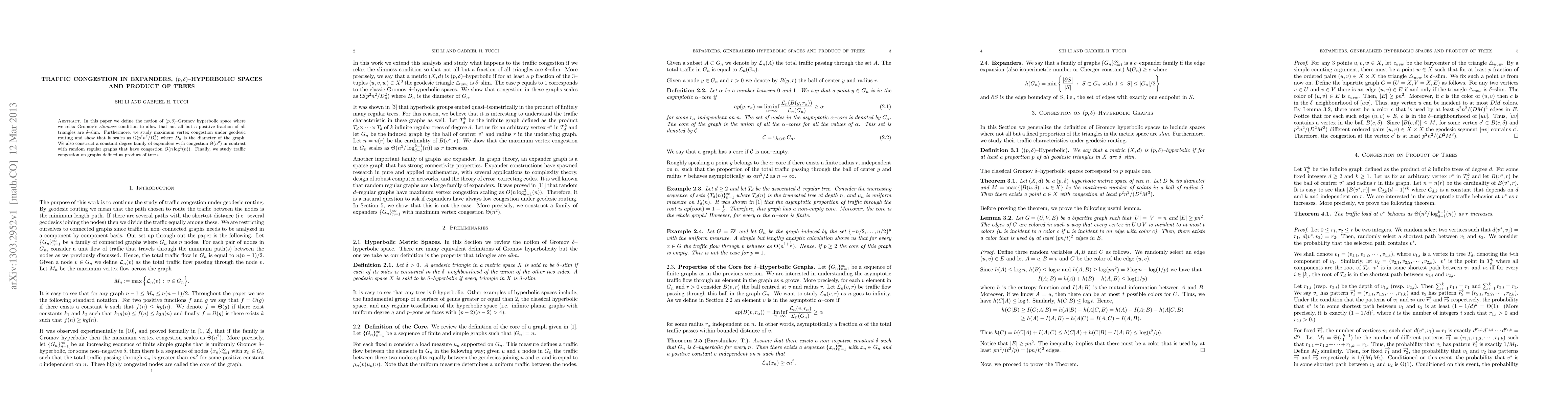 In this paper we define the notion of $(p,\delta)$--Gromov hyperbolic space where we relax Gromov's {\it slimness} condition to allow that not all but a positive fraction of all triangles are $\delta$--slim. Furthermore, we study maximum vertex congestion under geodesic routing and show that it scales as $\Omega(p^2n^2/D_n^2)$ where $D_n$ is the diameter of the graph. We also construct a constant degree family of expanders with congestion $\Theta(n^2)$ in contrast with random regular graphs that have congestion $O(n\log^{3}(n))$. Finally, we study traffic congestion on graphs defined as product of trees.
