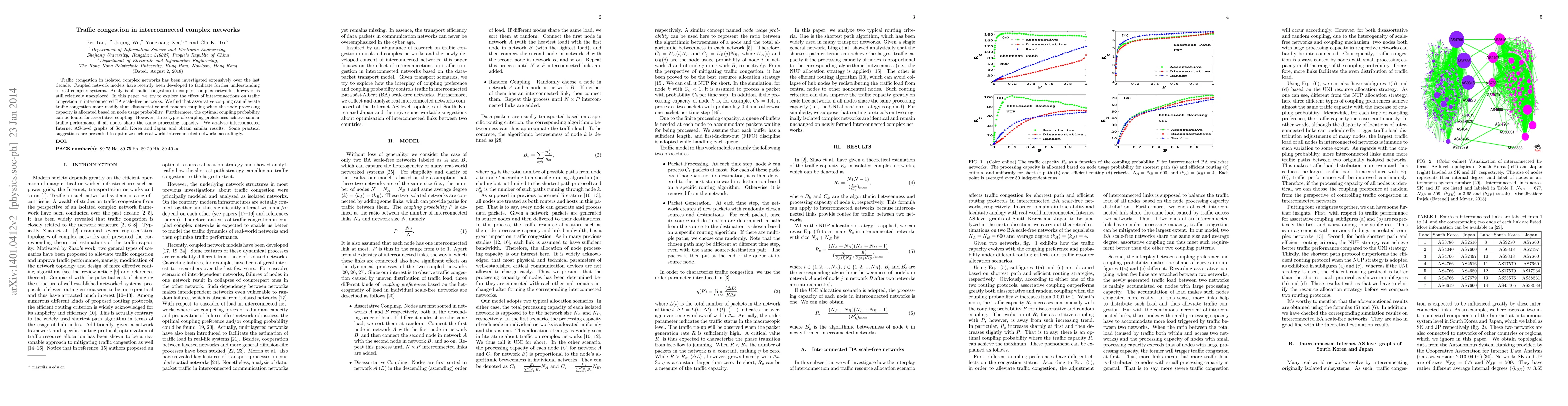 This paper investigates traffic congestion in interconnected complex networks, specifically BA scale-free networks, and finds that assortative coupling can alleviate congestion more effectively than disassortative or random coupling when node processing capacity is allocated based on usage probability. The study also analyzes real-world Internet AS-level graphs from South Korea and Japan, offering practical suggestions for optimizing such networks.