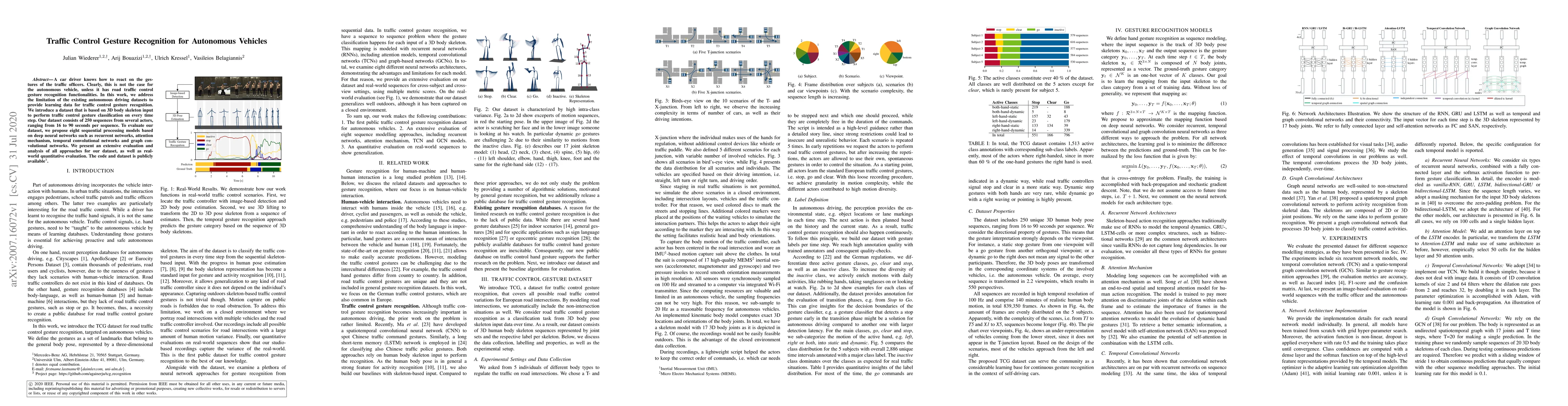 A car driver knows how to react on the gestures of the traffic officers. Clearly, this is not the case for the autonomous vehicle, unless it has road traffic control gesture recognition functionalities. In this work, we address the limitation of the existing autonomous driving datasets to provide learning data for traffic control gesture recognition. We introduce a dataset that is based on 3D body skeleton input to perform traffic control gesture classification on every time step. Our dataset consists of 250 sequences from several actors, ranging from 16 to 90 seconds per sequence. To evaluate our dataset, we propose eight sequential processing models based on deep neural networks such as recurrent networks, attention mechanism, temporal convolutional networks and graph convolutional networks. We present an extensive evaluation and analysis of all approaches for our dataset, as well as real-world quantitative evaluation. The code and dataset is publicly available.