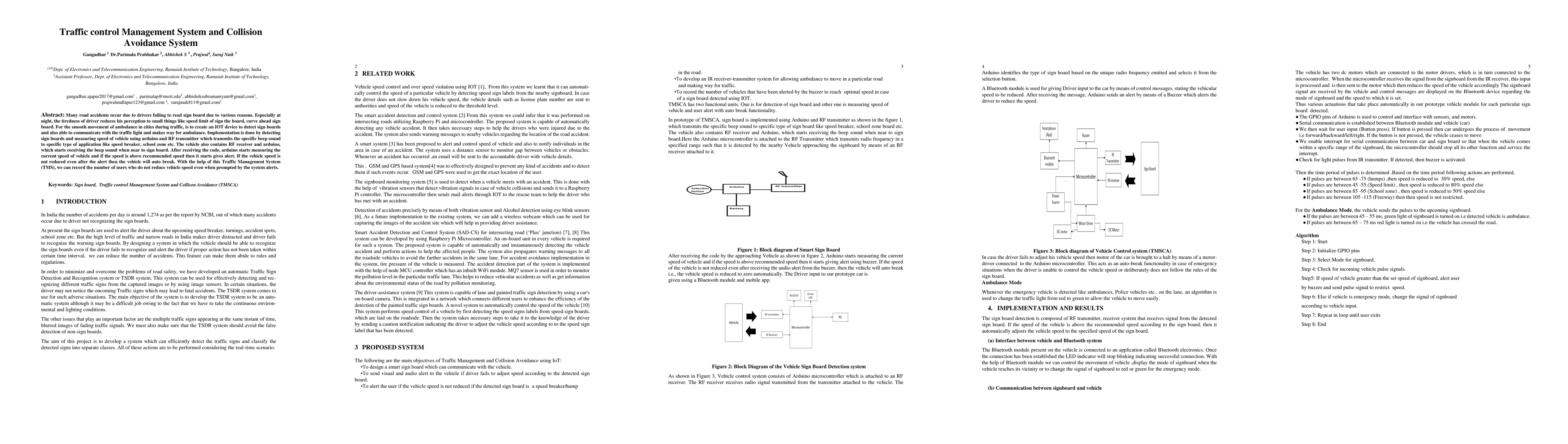 Many road accidents occur due to drivers failing to read sign board due to various reasons. Especially at night, the tiredness of driver reduces his perception to small things like speed limit of sign the board, curve ahead sign board. For the smooth movement of ambulance in cities during traffic, is to create an IOT device to detect sign boards and also able to com-municate with the traffic light and makes way for ambulance. Implementation is done by detecting sign boards and measuring speed of vehicle using arduino and RF transmitter which transmits the specific beep sound to specific type of application like speed breaker, school zone etc. The vehicle also contains RF receiver and arduino, which starts receiving the beep sound when near to sign board. After receiving the code, arduino starts measuring the current speed of vehicle and if the speed is above recommended speed then it starts gives alert. If the vehicle speed is not reduced even after the alert then the vehicle will auto break. With the help of this Traffic Management System (TMS), we can record the number of users who do not reduce vehicle speed even when prompted by the system alerts.
