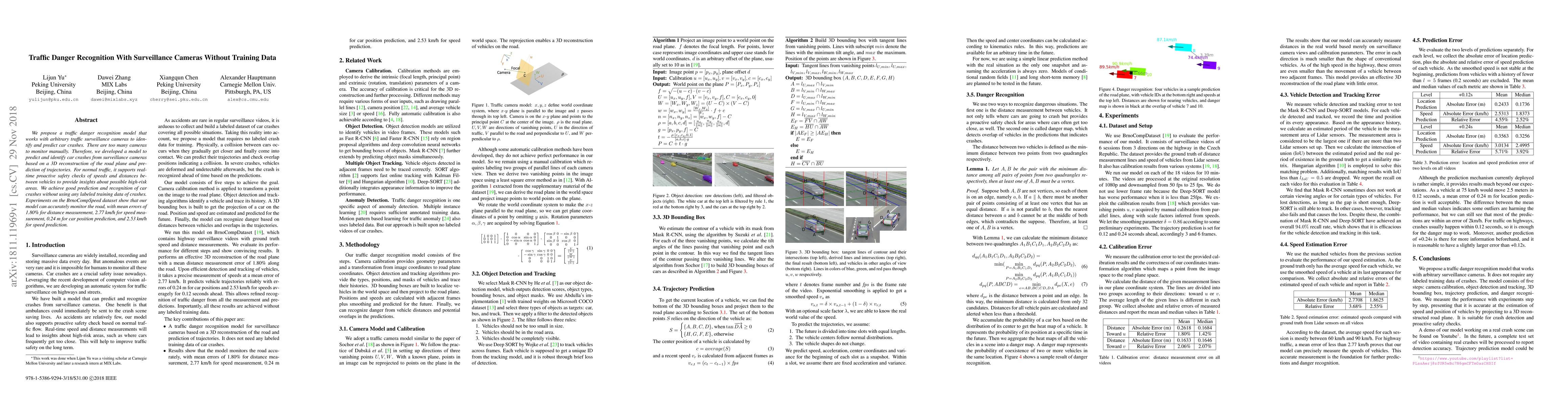 This paper presents a traffic danger recognition model that identifies and predicts car crashes using surveillance cameras without requiring labeled training data. The model employs 3D road reconstruction and trajectory prediction to monitor traffic and detect high-risk areas, achieving accurate measurements and predictions on the BrnoCompSpeed dataset.