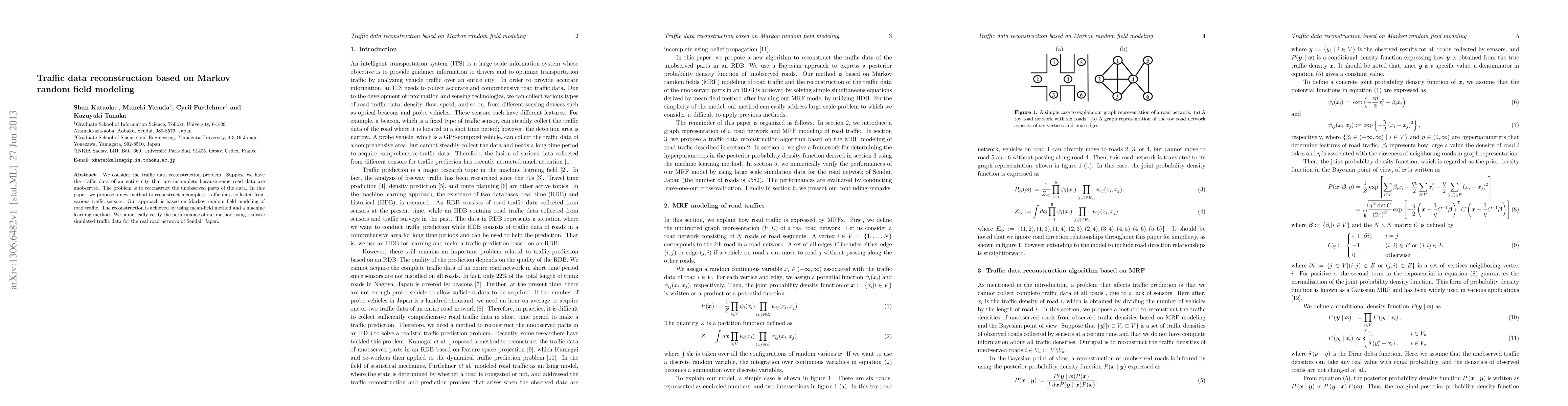 We consider the traffic data reconstruction problem. Suppose we have the traffic data of an entire city that are incomplete because some road data are unobserved. The problem is to reconstruct the unobserved parts of the data. In this paper, we propose a new method to reconstruct incomplete traffic data collected from various traffic sensors. Our approach is based on Markov random field modeling of road traffic. The reconstruction is achieved by using mean-field method and a machine learning method. We numerically verify the performance of our method using realistic simulated traffic data for the real road network of Sendai, Japan.