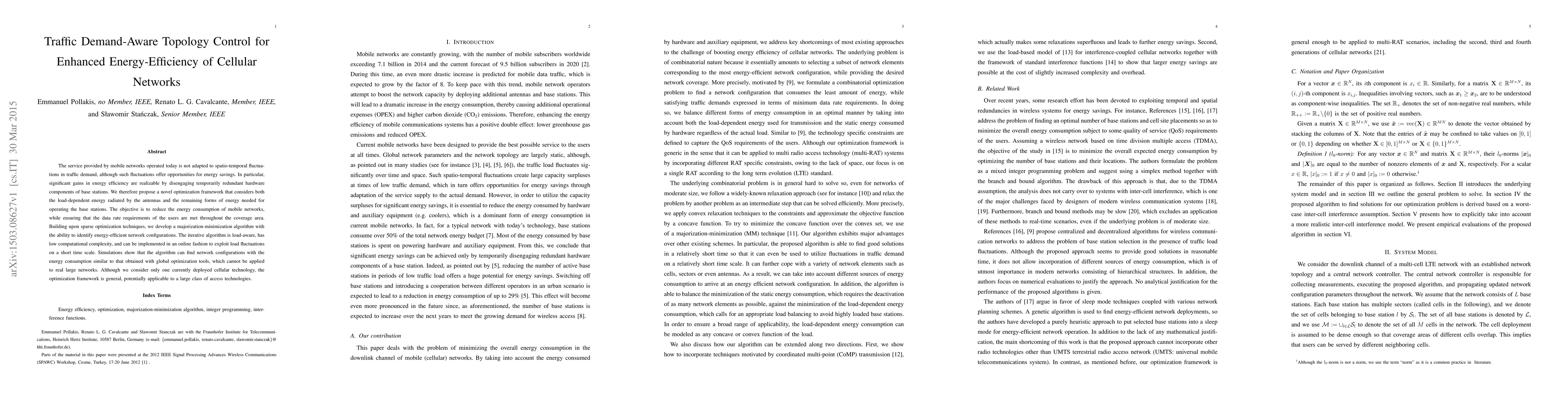 This paper proposes an optimization framework to enhance energy efficiency in cellular networks by dynamically adjusting topology based on traffic demand fluctuations. The developed majorization-minimization algorithm identifies energy-efficient configurations with low computational complexity, ensuring user data rate requirements are met.