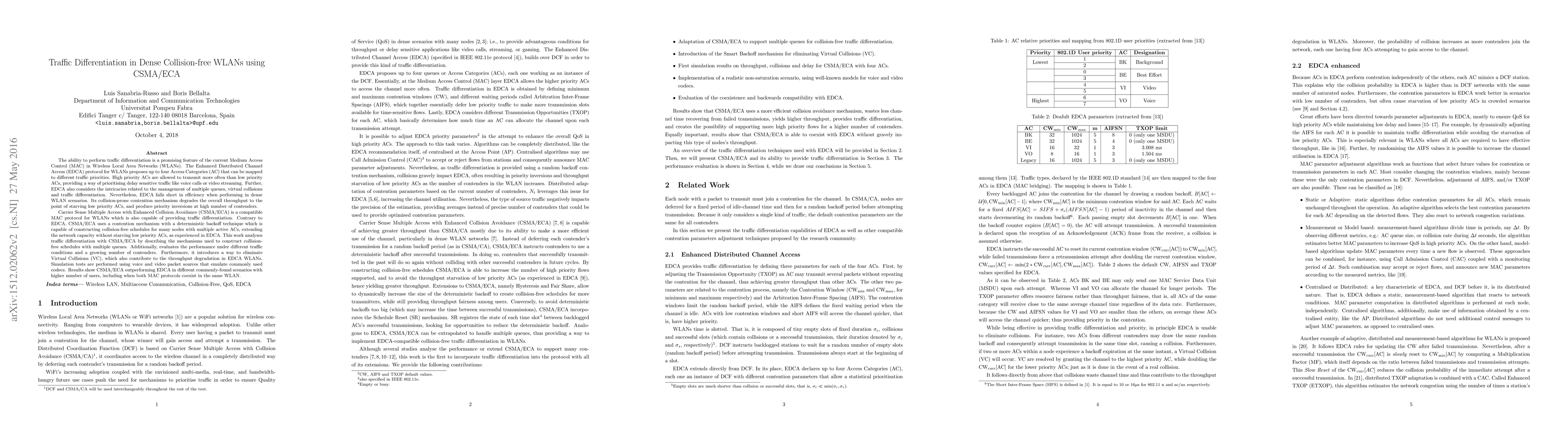 This paper explores traffic differentiation in dense WLANs using CSMA/ECA, a MAC protocol that enhances throughput and prevents starvation of low priority traffic compared to EDCA. CSMA/ECA employs a deterministic backoff mechanism to create collision-free schedules, thereby improving network capacity and prioritizing delay-sensitive traffic effectively.