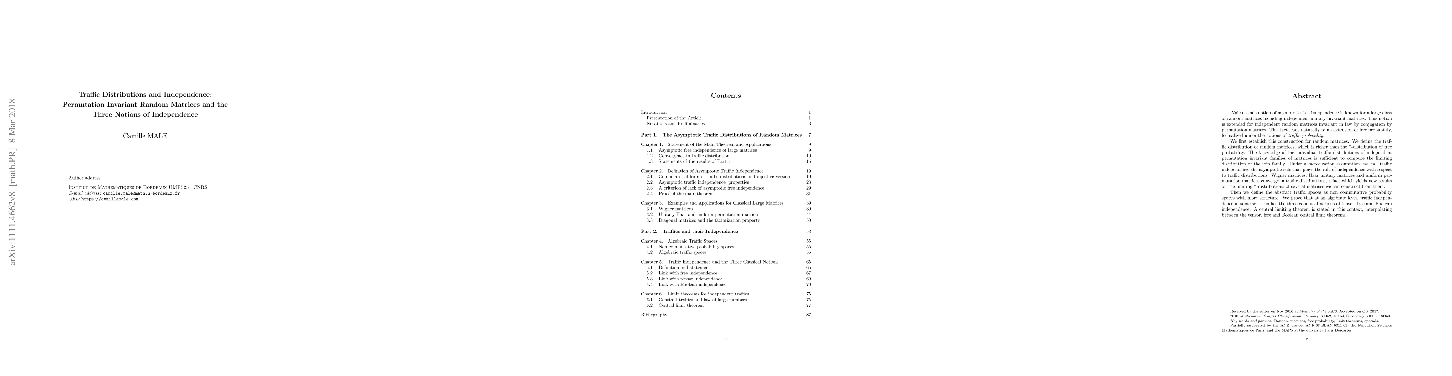This paper extends Voiculescu's notion of asymptotic free independence to permutation invariant random matrices, introducing traffic distributions and traffic independence. It establishes traffic probability theory, showing that knowledge of individual traffic distributions allows computation of the limiting distribution of a joint family, thus unifying three notions of independence and proving a central limiting theorem.