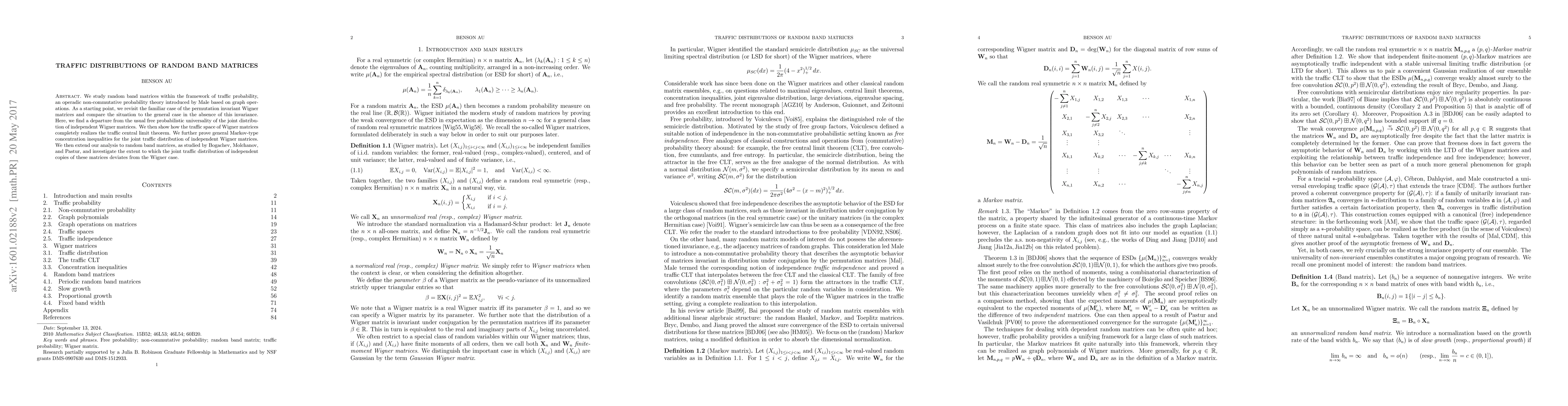 This paper explores random band matrices using traffic probability, comparing them to permutation invariant Wigner matrices and finding deviations from typical free probabilistic universality. It proves concentration inequalities and extends the analysis to random band matrices, investigating their joint distribution differences from the Wigner case.