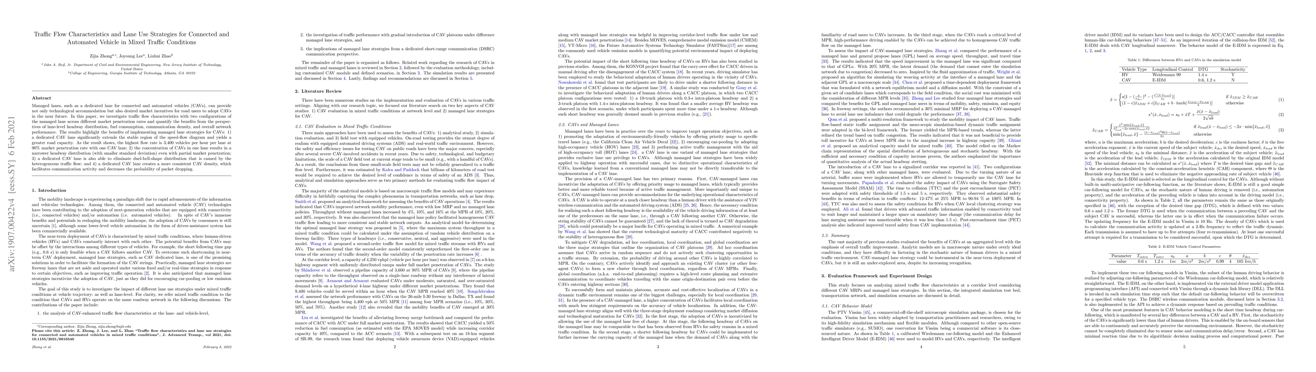 This paper examines traffic flow characteristics and lane use strategies for connected and automated vehicles (CAVs) in mixed traffic conditions, finding that dedicated CAV lanes significantly enhance road capacity and stability, reduce headway variability, and improve communication efficiency. The optimal flow rate observed is 3,400 vehicles per hour per lane at a 90% market penetration rate.