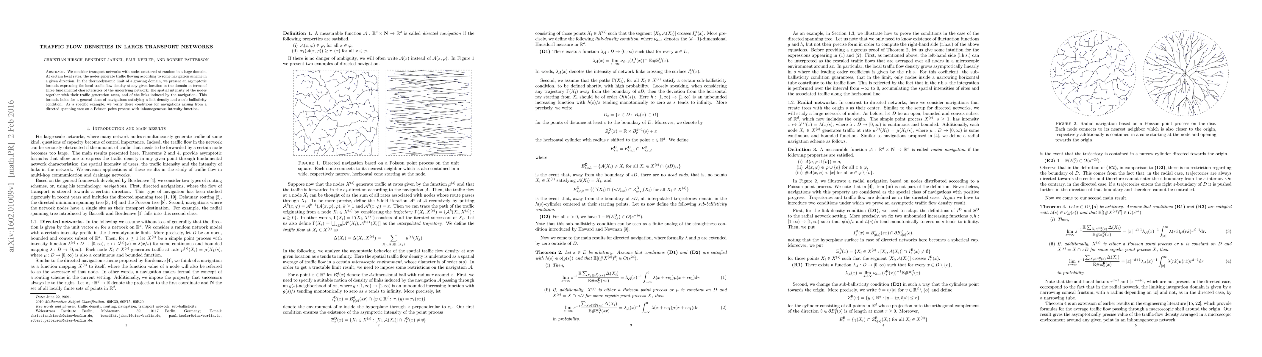 We consider transport networks with nodes scattered at random in a large domain. At certain local rates, the nodes generate traffic flowing according to some navigation scheme in a given direction. In the thermodynamic limit of a growing domain, we present an asymptotic formula expressing the local traffic flow density at any given location in the domain in terms of three fundamental characteristics of the underlying network: the spatial intensity of the nodes together with their traffic generation rates, and of the links induced by the navigation. This formula holds for a general class of navigations satisfying a link-density and a sub-ballisticity condition. As a specific example, we verify these conditions for navigations arising from a directed spanning tree on a Poisson point process with inhomogeneous intensity function.