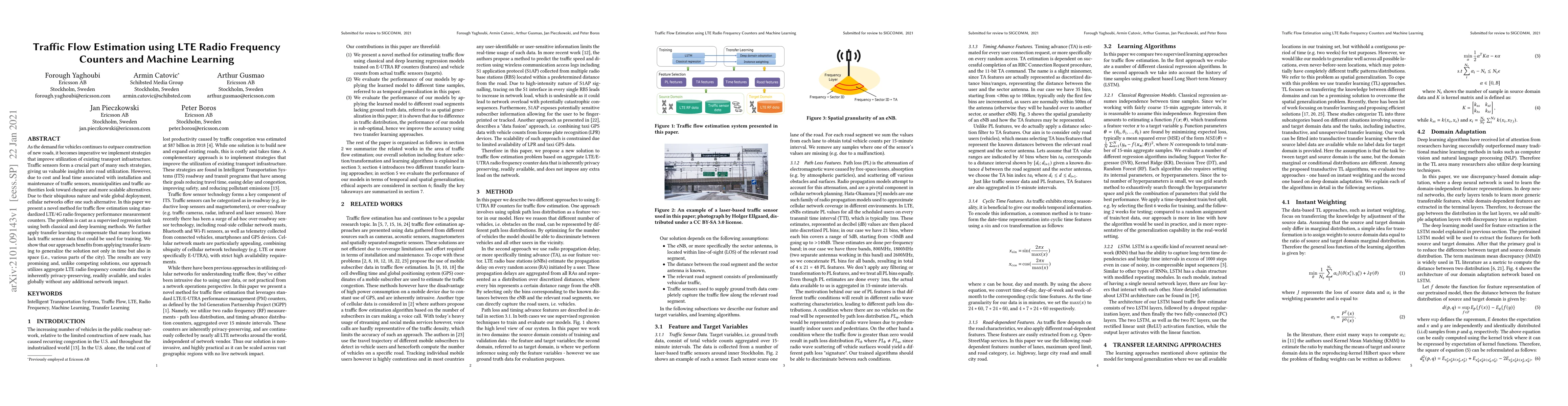 This research introduces a method for estimating traffic flow using LTE radio frequency counters and machine learning. It demonstrates that transfer learning can generalize the solution across time and locations, offering a cost-effective, privacy-preserving, and globally scalable alternative to traditional traffic sensors.