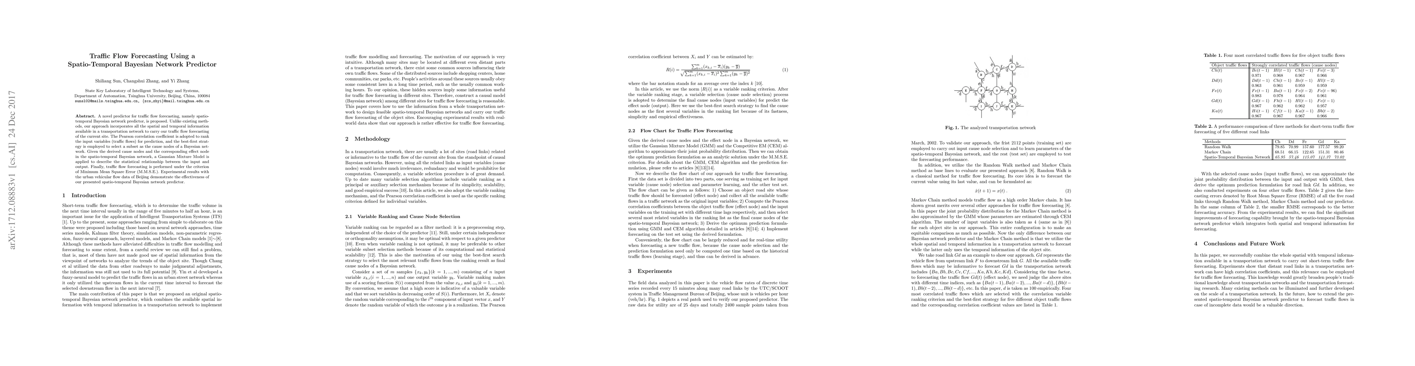 A novel predictor for traffic flow forecasting, namely spatio-temporal Bayesian network predictor, is proposed. Unlike existing methods, our approach incorporates all the spatial and temporal information available in a transportation network to carry our traffic flow forecasting of the current site. The Pearson correlation coefficient is adopted to rank the input variables (traffic flows) for prediction, and the best-first strategy is employed to select a subset as the cause nodes of a Bayesian network. Given the derived cause nodes and the corresponding effect node in the spatio-temporal Bayesian network, a Gaussian Mixture Model is applied to describe the statistical relationship between the input and output. Finally, traffic flow forecasting is performed under the criterion of Minimum Mean Square Error (M.M.S.E.). Experimental results with the urban vehicular flow data of Beijing demonstrate the effectiveness of our presented spatio-temporal Bayesian network predictor.