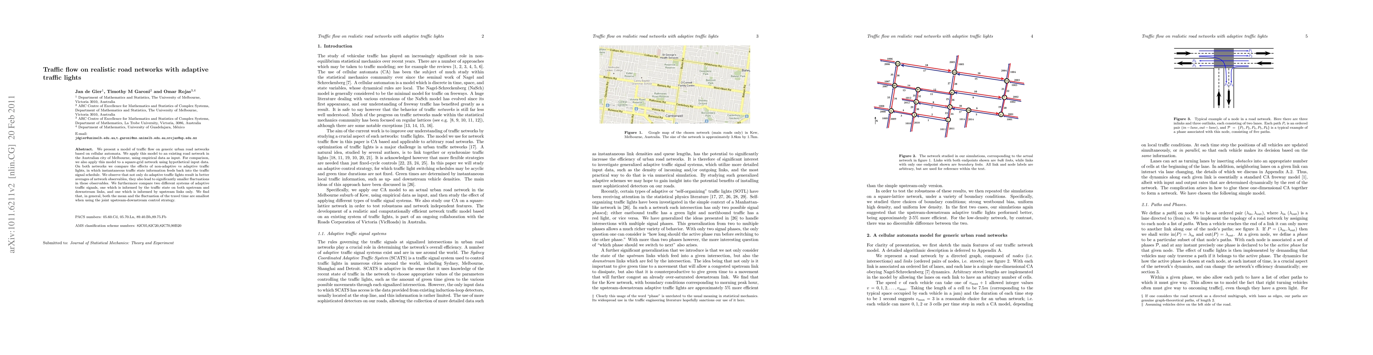 This paper models traffic flow on urban road networks using cellular automata, comparing adaptive traffic lights to non-adaptive ones in Melbourne and a hypothetical grid network. Adaptive traffic lights significantly improve average network performance and reduce fluctuations, with the best results achieved by a control strategy that uses both upstream and downstream traffic state information.