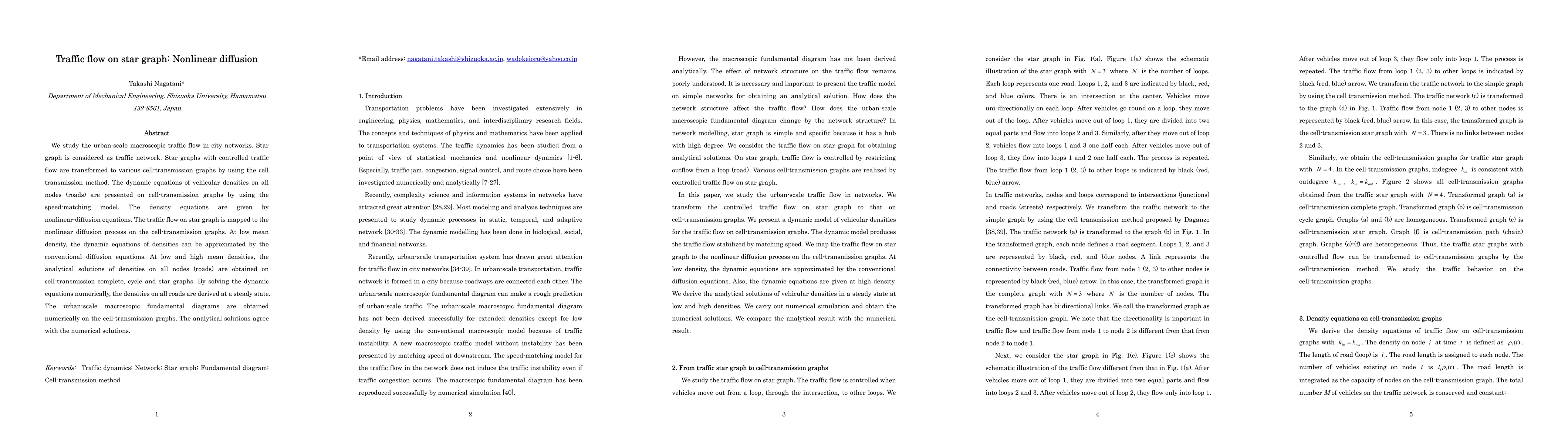 This research explores urban-scale traffic flow in city networks modeled as star graphs, transforming them into cell-transmission graphs to derive dynamic equations for vehicular densities using the speed-matching model, which are represented by nonlinear diffusion equations. Analytical and numerical solutions are obtained, confirming the accuracy of the macroscopic fundamental diagrams.