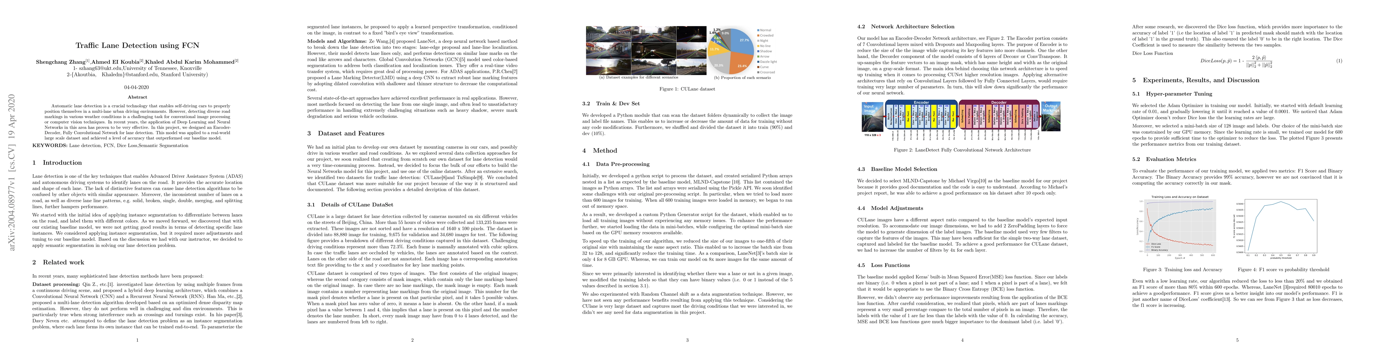 Automatic lane detection is a crucial technology that enables self-driving cars to properly position themselves in a multi-lane urban driving environments. However, detecting diverse road markings in various weather conditions is a challenging task for conventional image processing or computer vision techniques. In recent years, the application of Deep Learning and Neural Networks in this area has proven to be very effective. In this project, we designed an Encoder- Decoder, Fully Convolutional Network for lane detection. This model was applied to a real-world large scale dataset and achieved a level of accuracy that outperformed our baseline model.