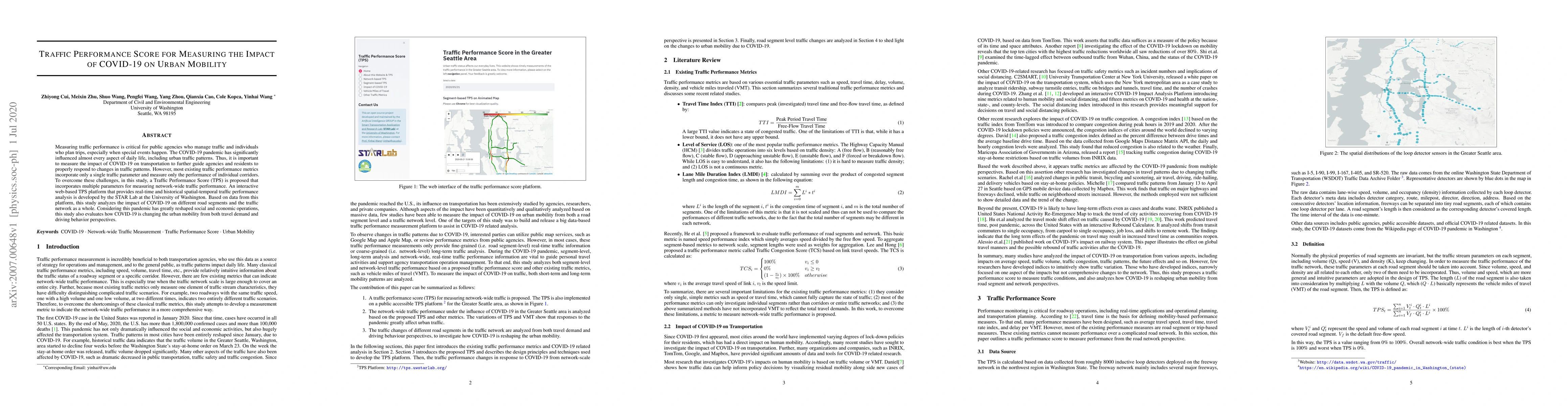 A new Traffic Performance Score (TPS) is proposed to measure network-wide traffic performance, analyzing COVID-19's impact on urban mobility from both travel demand and driving behavior perspectives.