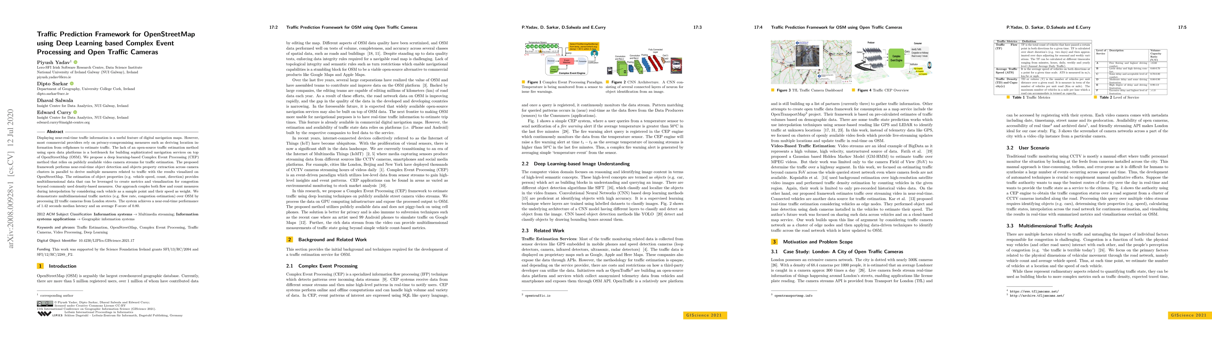 This paper proposes a deep learning-based framework for near-real-time traffic prediction on OpenStreetMap using open traffic camera streams. The method employs Complex Event Processing to derive multidimensional traffic metrics, achieving a median latency of 1.42 seconds and an average F-score of 0.80.