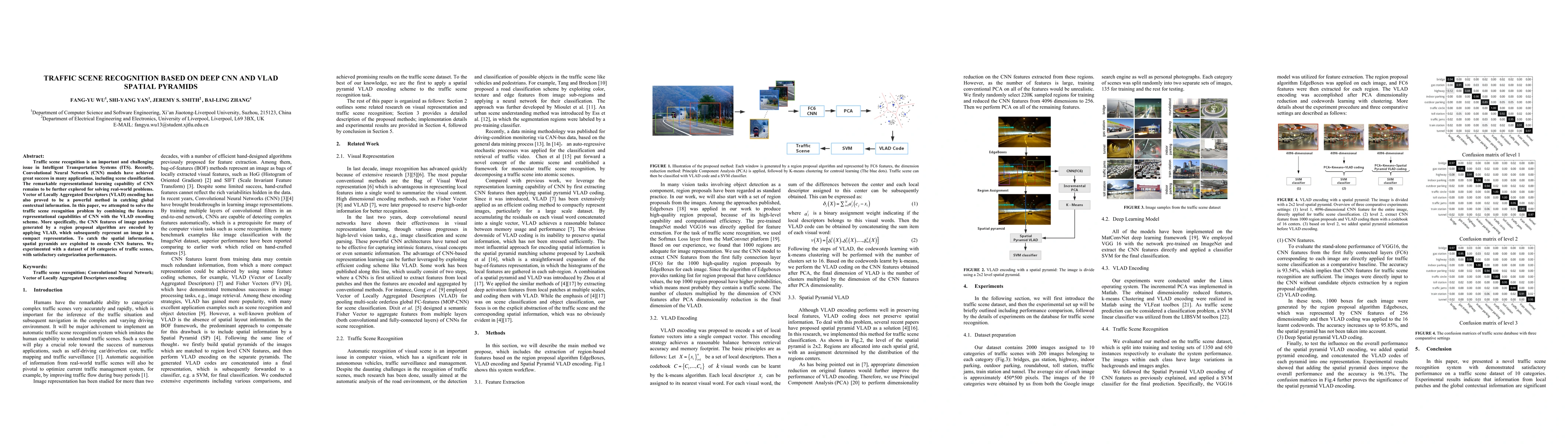 This paper combines Convolutional Neural Networks (CNN) and Vector of Locally Aggregated Descriptors (VLAD) spatial pyramids to enhance traffic scene recognition in Intelligent Transportation Systems. The method uses CNN for feature extraction and VLAD for encoding, achieving satisfactory categorization performance on a dataset of 10 traffic scene categories.