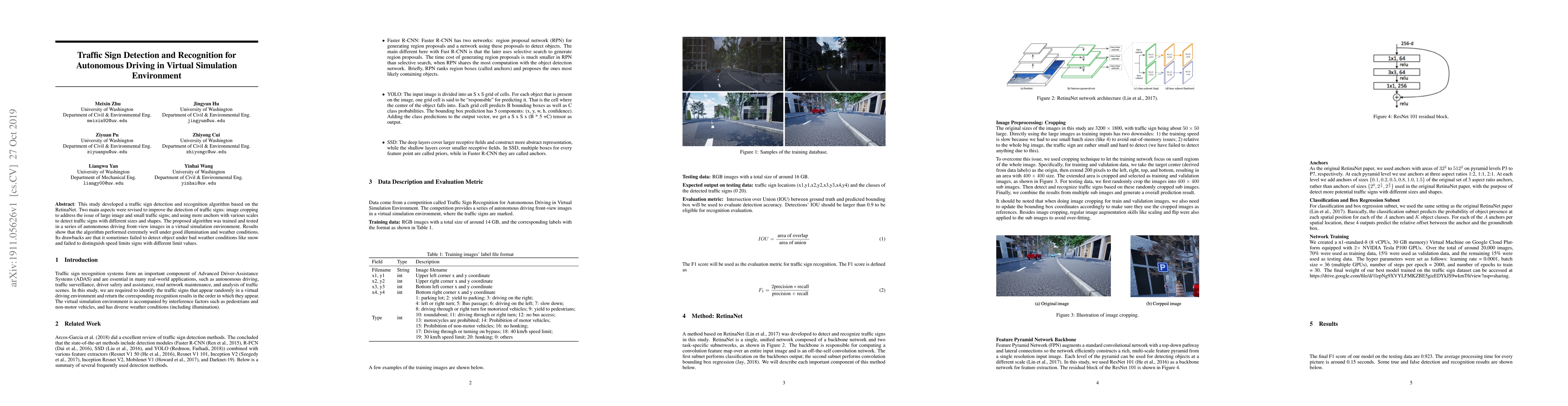 This study developed a traffic sign detection and recognition algorithm based on the RetinaNet. Two main aspects were revised to improve the detection of traffic signs: image cropping to address the issue of large image and small traffic signs; and using more anchors with various scales to detect traffic signs with different sizes and shapes. The proposed algorithm was trained and tested in a series of autonomous driving front-view images in a virtual simulation environment. Results show that the algorithm performed extremely well under good illumination and weather conditions. Its drawbacks are that it sometimes failed to detect object under bad weather conditions like snow and failed to distinguish speed limits signs with different limit values.