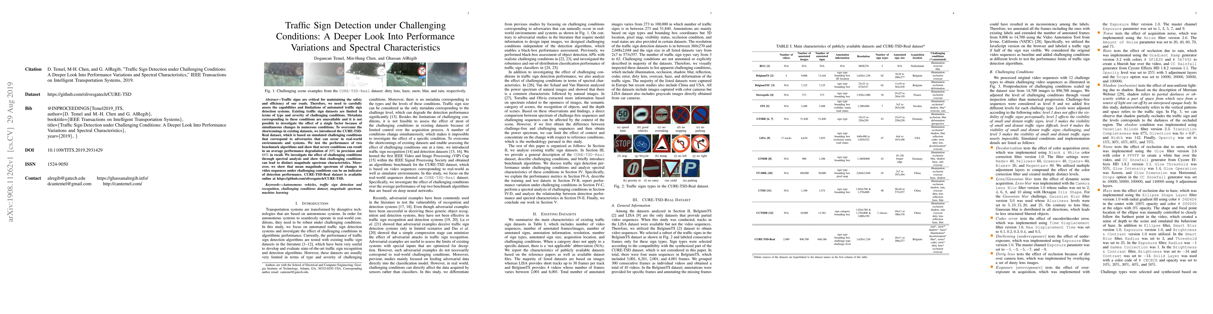 This paper introduces the CURE-TSD-Real dataset to evaluate automated traffic sign detection systems under challenging conditions, revealing a 29% precision and 68% recall drop under severe conditions. Spectral analysis indicates distinct magnitude spectrum characteristics under challenging conditions, suggesting that mean magnitude spectrum of video sequences can predict detection performance.