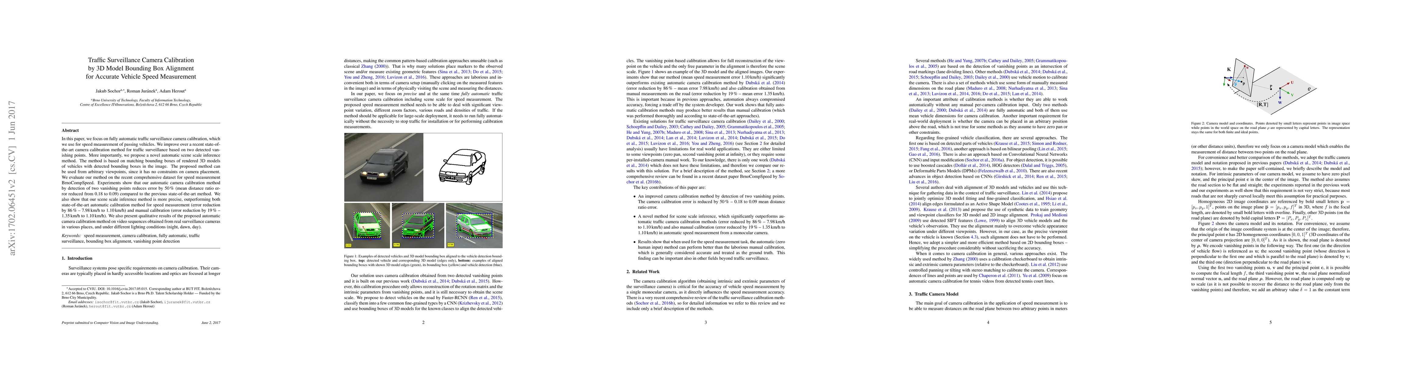 This paper presents an automatic camera calibration method for traffic surveillance that improves vehicle speed measurement accuracy by matching 3D model bounding boxes with detected image boxes. The method reduces error by 50% compared to previous methods and achieves an 86% reduction in error for scene scale inference.
