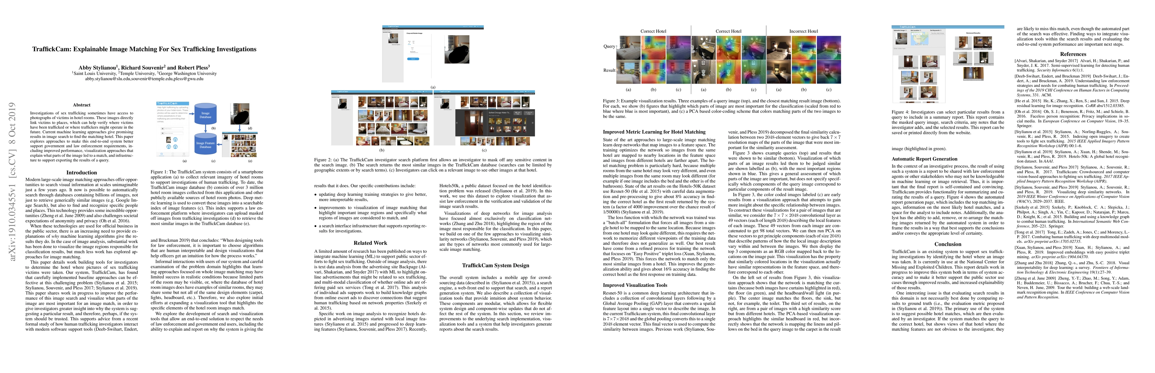 Investigations of sex trafficking sometimes have access to photographs of victims in hotel rooms. These images directly link victims to places, which can help verify where victims have been trafficked or where traffickers might operate in the future. Current machine learning approaches give promising results in image search to find the matching hotel. This paper explores approaches to make this end-to-end system better support government and law enforcement requirements, including improved performance, visualization approaches that explain what parts of the image led to a match, and infrastructure to support exporting the results of a query.