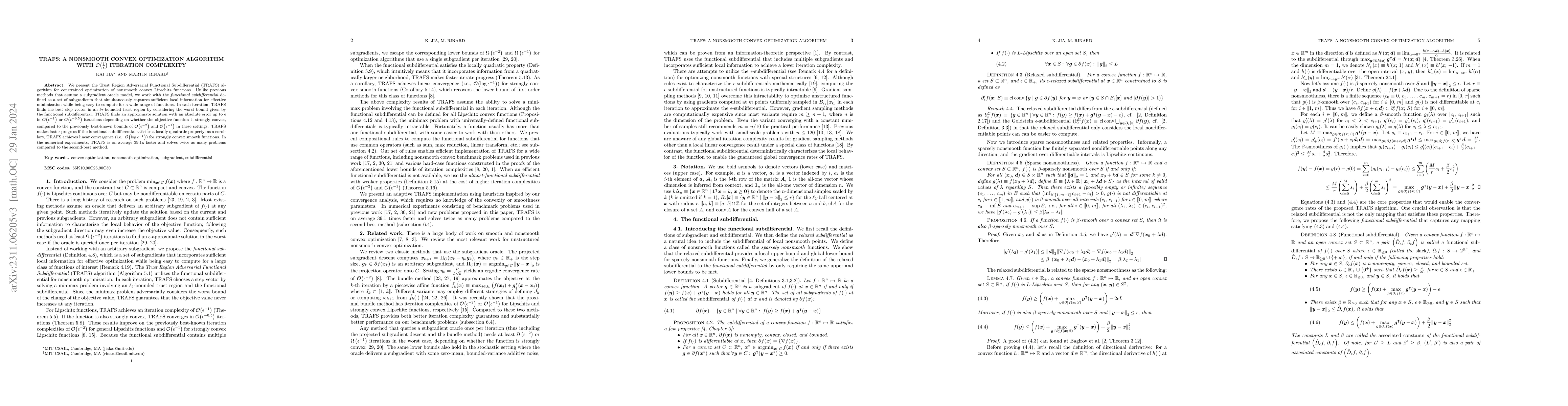 The TRAFS algorithm offers a novel approach to nonsmooth convex optimization, achieving $\mathcal{O}\left(\frac{1}{\epsilon}\right)$ iteration complexity by leveraging the functional subdifferential. It outperforms existing methods, especially in strongly convex settings, and demonstrates significant speed improvements in numerical experiments.