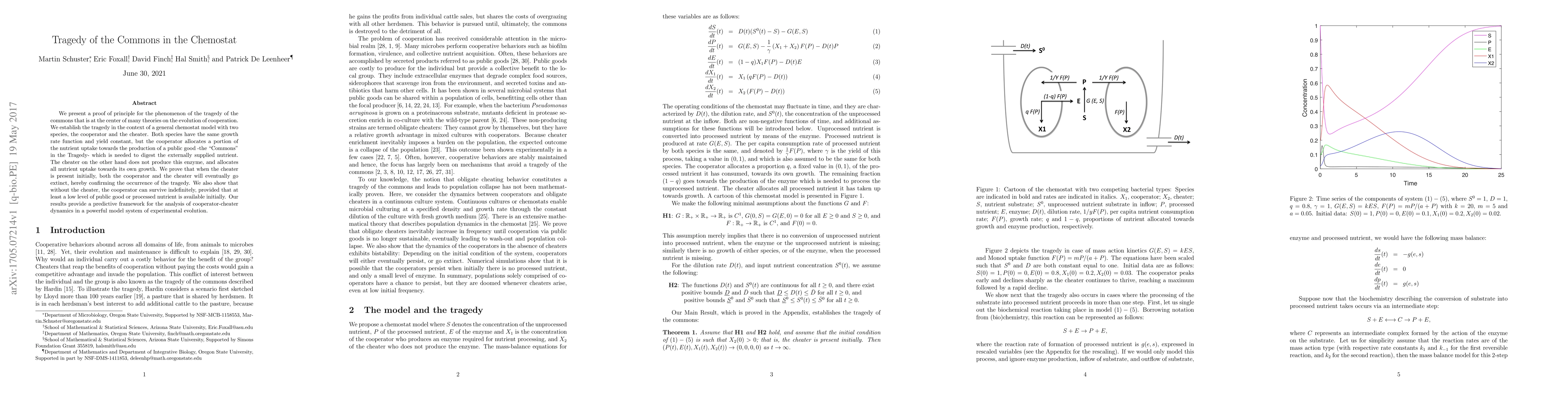 We present a proof of principle for the phenomenon of the tragedy of the commons that is at the center of many theories on the evolution of cooperation. We establish the tragedy in the context of a general chemostat model with two species, the cooperator and the cheater. Both species have the same growth rate function and yield constant, but the cooperator allocates a portion of the nutrient uptake towards the production of a public good -the "Commons" in the Tragedy- which is needed to digest the externally supplied nutrient. The cheater on the other hand does not produce this enzyme, and allocates all nutrient uptake towards its own growth. We prove that when the cheater is present initially, both the cooperator and the cheater will eventually go extinct, hereby confirming the occurrence of the tragedy. We also show that without the cheater, the cooperator can survive indefinitely, provided that at least a low level of public good or processed nutrient is available initially. Our results provide a predictive framework for the analysis of cooperator-cheater dynamics in a powerful model system of experimental evolution.