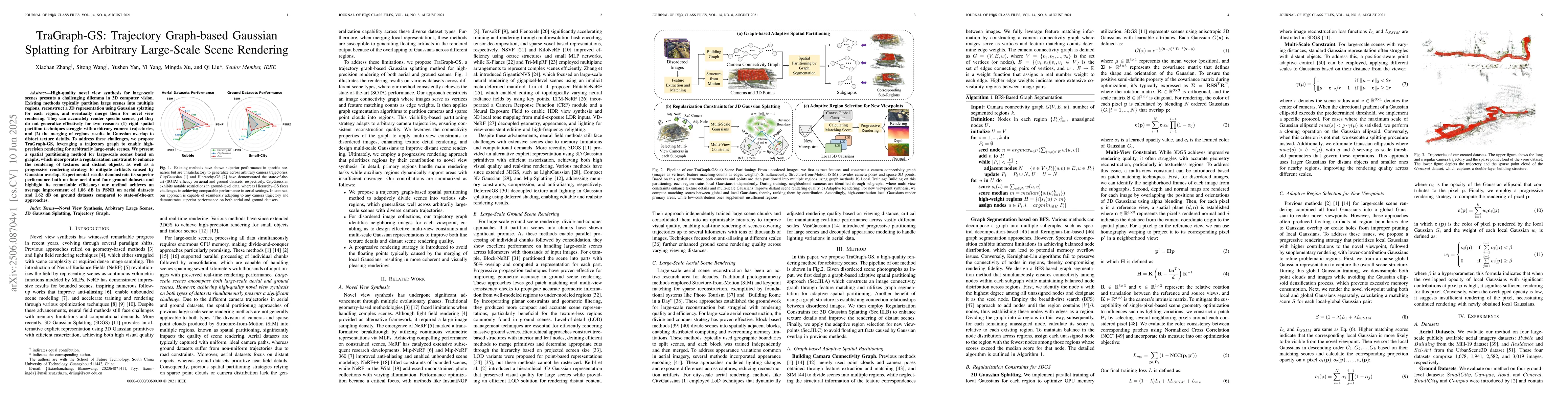 TraGraph-GS proposes a novel method for high-quality novel view synthesis of large-scale scenes, addressing challenges of partitioning and merging regions to achieve accurate rendering of textures and distant objects.