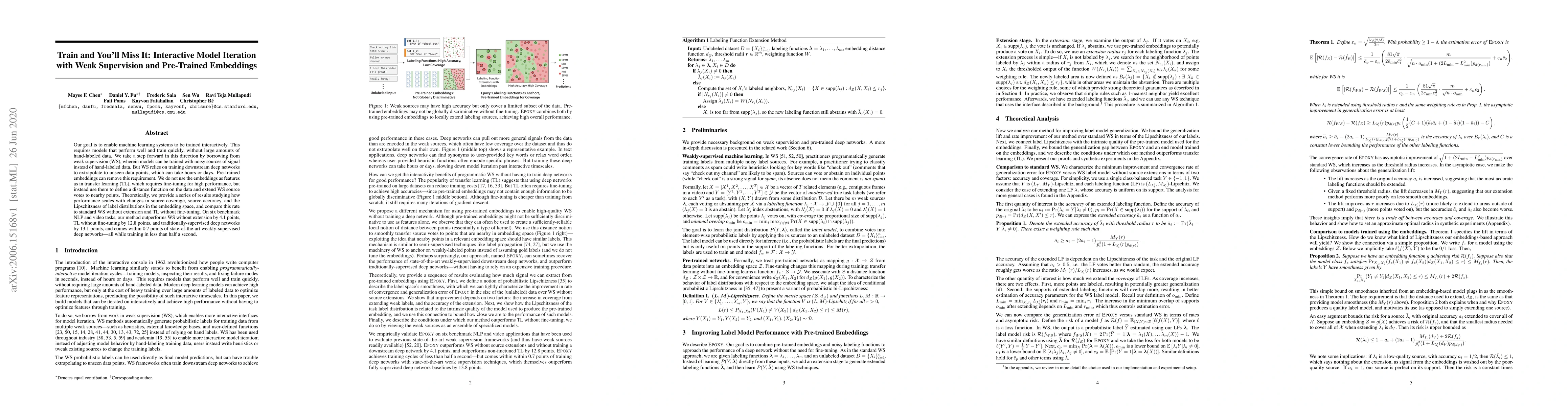 Our goal is to enable machine learning systems to be trained interactively. This requires models that perform well and train quickly, without large amounts of hand-labeled data. We take a step forward in this direction by borrowing from weak supervision (WS), wherein models can be trained with noisy sources of signal instead of hand-labeled data. But WS relies on training downstream deep networks to extrapolate to unseen data points, which can take hours or days. Pre-trained embeddings can remove this requirement. We do not use the embeddings as features as in transfer learning (TL), which requires fine-tuning for high performance, but instead use them to define a distance function on the data and extend WS source votes to nearby points. Theoretically, we provide a series of results studying how performance scales with changes in source coverage, source accuracy, and the Lipschitzness of label distributions in the embedding space, and compare this rate to standard WS without extension and TL without fine-tuning. On six benchmark NLP and video tasks, our method outperforms WS without extension by 4.1 points, TL without fine-tuning by 12.8 points, and traditionally-supervised deep networks by 13.1 points, and comes within 0.7 points of state-of-the-art weakly-supervised deep networks-all while training in less than half a second.