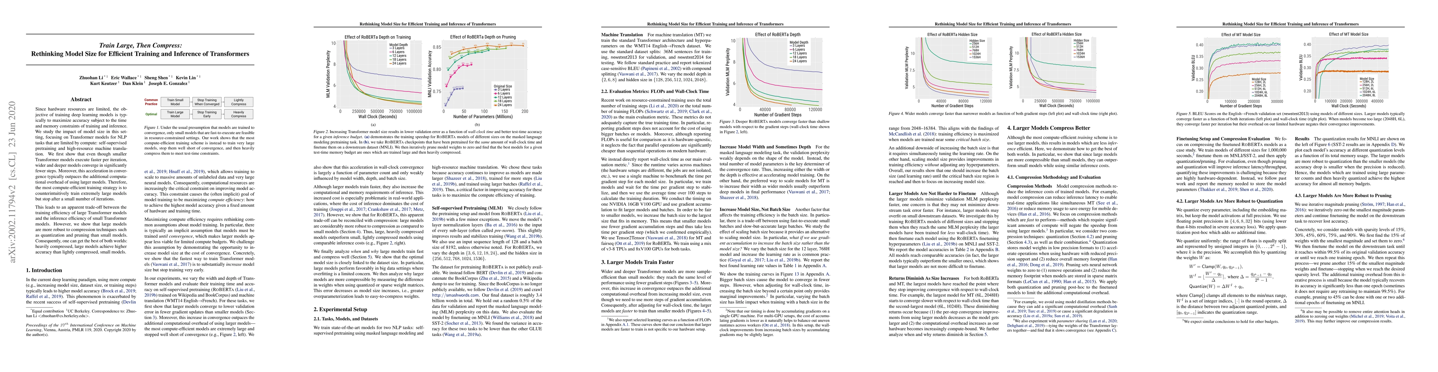 This paper argues that training extremely large Transformer models for a few iterations followed by compression yields the best performance in NLP tasks, despite the initial larger computational cost. It demonstrates that large models converge faster and are more robust to compression, leading to better accuracy than smaller, lightly compressed models.