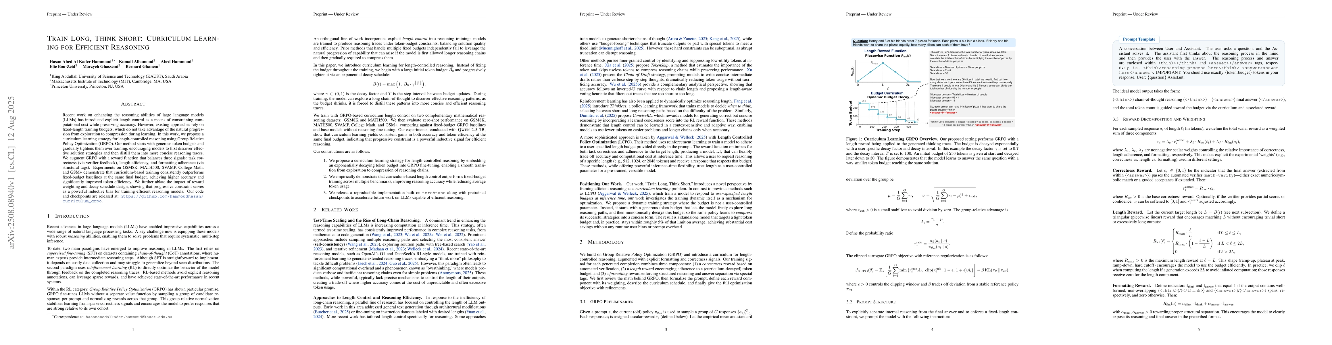 Recent work on enhancing the reasoning abilities of large language models (LLMs) has introduced explicit length control as a means of constraining computational cost while preserving accuracy. However, existing approaches rely on fixed-length training budgets, which do not take advantage of the natural progression from exploration to compression during learning. In this work, we propose a curriculum learning strategy for length-controlled reasoning using Group Relative Policy Optimization (GRPO). Our method starts with generous token budgets and gradually tightens them over training, encouraging models to first discover effective solution strategies and then distill them into more concise reasoning traces. We augment GRPO with a reward function that balances three signals: task correctness (via verifier feedback), length efficiency, and formatting adherence (via structural tags). Experiments on GSM8K, MATH500, SVAMP, College Math, and GSM+ demonstrate that curriculum-based training consistently outperforms fixed-budget baselines at the same final budget, achieving higher accuracy and significantly improved token efficiency. We further ablate the impact of reward weighting and decay schedule design, showing that progressive constraint serves as a powerful inductive bias for training efficient reasoning models. Our code and checkpoints are released at: https://github.com/hammoudhasan/curriculum_grpo.