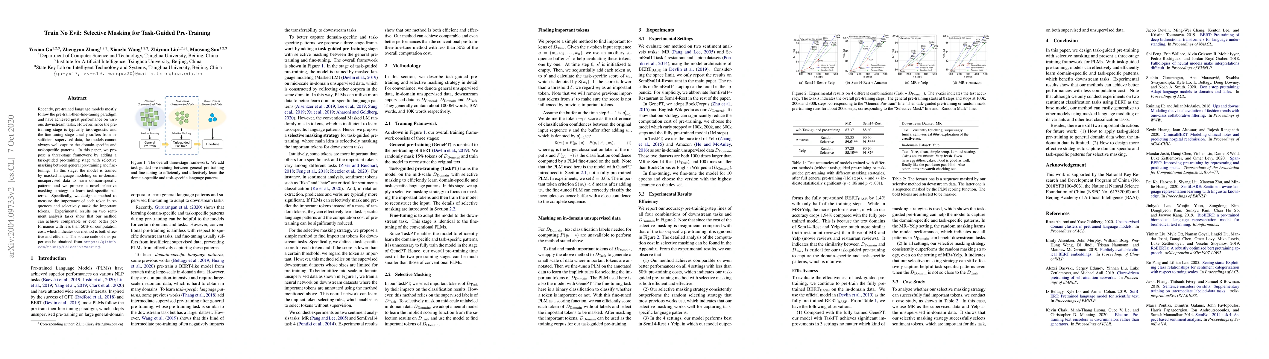 This paper proposes a three-stage framework for pre-trained language models that includes a novel task-guided pre-training stage with selective masking, aiming to better capture domain-specific and task-specific patterns. Experimental results on sentiment analysis tasks demonstrate comparable or superior performance with reduced computational cost.