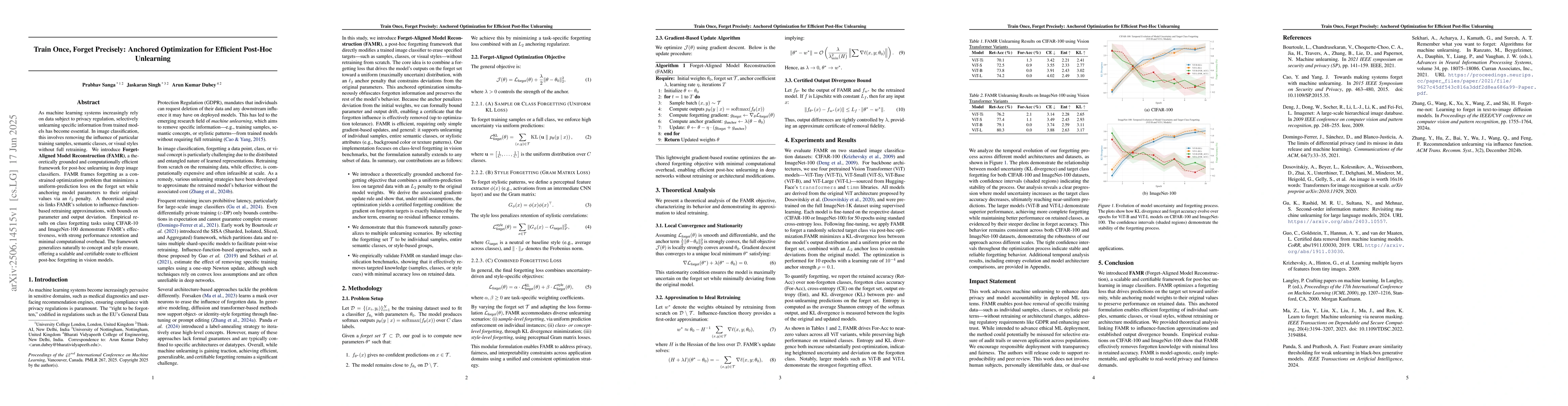 As machine learning systems increasingly rely on data subject to privacy regulation, selectively unlearning specific information from trained models has become essential. In image classification, this involves removing the influence of particular training samples, semantic classes, or visual styles without full retraining. We introduce \textbf{Forget-Aligned Model Reconstruction (FAMR)}, a theoretically grounded and computationally efficient framework for post-hoc unlearning in deep image classifiers. FAMR frames forgetting as a constrained optimization problem that minimizes a uniform-prediction loss on the forget set while anchoring model parameters to their original values via an $\ell_2$ penalty. A theoretical analysis links FAMR's solution to influence-function-based retraining approximations, with bounds on parameter and output deviation. Empirical results on class forgetting tasks using CIFAR-10 and ImageNet-100 demonstrate FAMR's effectiveness, with strong performance retention and minimal computational overhead. The framework generalizes naturally to concept and style erasure, offering a scalable and certifiable route to efficient post-hoc forgetting in vision models.