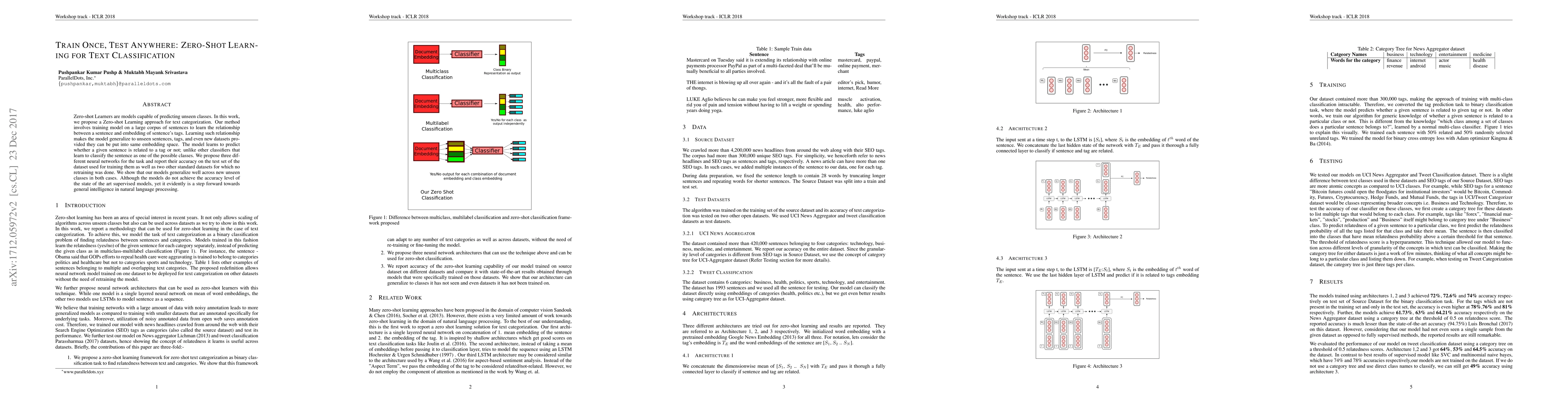 Zero-shot Learners are models capable of predicting unseen classes. In this work, we propose a Zero-shot Learning approach for text categorization. Our method involves training model on a large corpus of sentences to learn the relationship between a sentence and embedding of sentence's tags. Learning such relationship makes the model generalize to unseen sentences, tags, and even new datasets provided they can be put into same embedding space. The model learns to predict whether a given sentence is related to a tag or not; unlike other classifiers that learn to classify the sentence as one of the possible classes. We propose three different neural networks for the task and report their accuracy on the test set of the dataset used for training them as well as two other standard datasets for which no retraining was done. We show that our models generalize well across new unseen classes in both cases. Although the models do not achieve the accuracy level of the state of the art supervised models, yet it evidently is a step forward towards general intelligence in natural language processing.