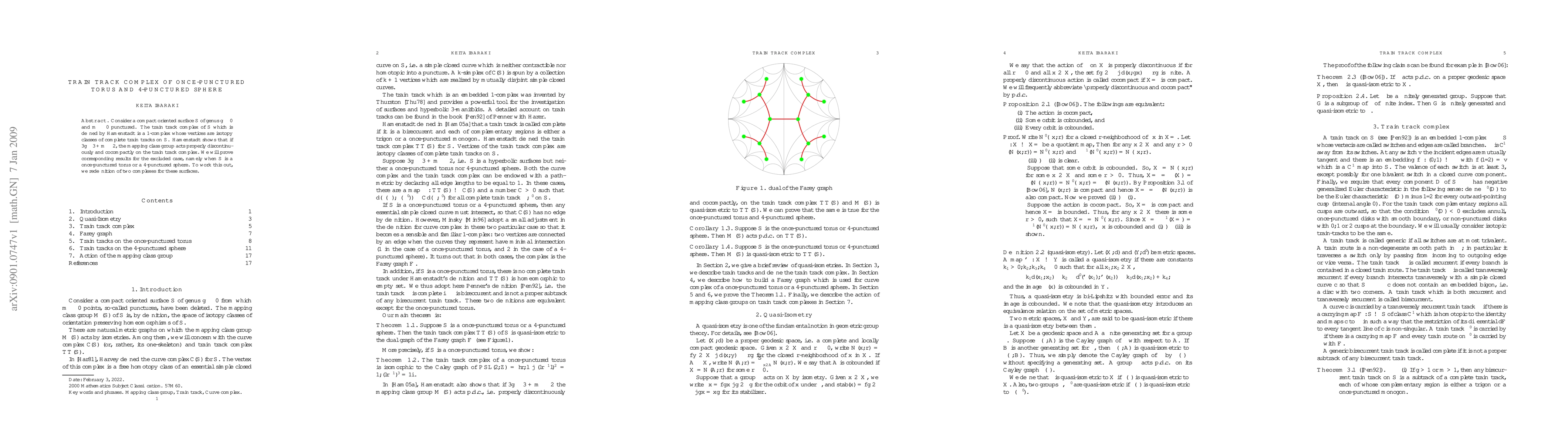 Summary: This paper explores the train track complex for a once-punctured torus and a 4-punctured sphere, proving that the mapping class group acts properly discontinuously and cocompactly on these complexes. The study redefines two specific complexes for these surfaces to achieve the results.