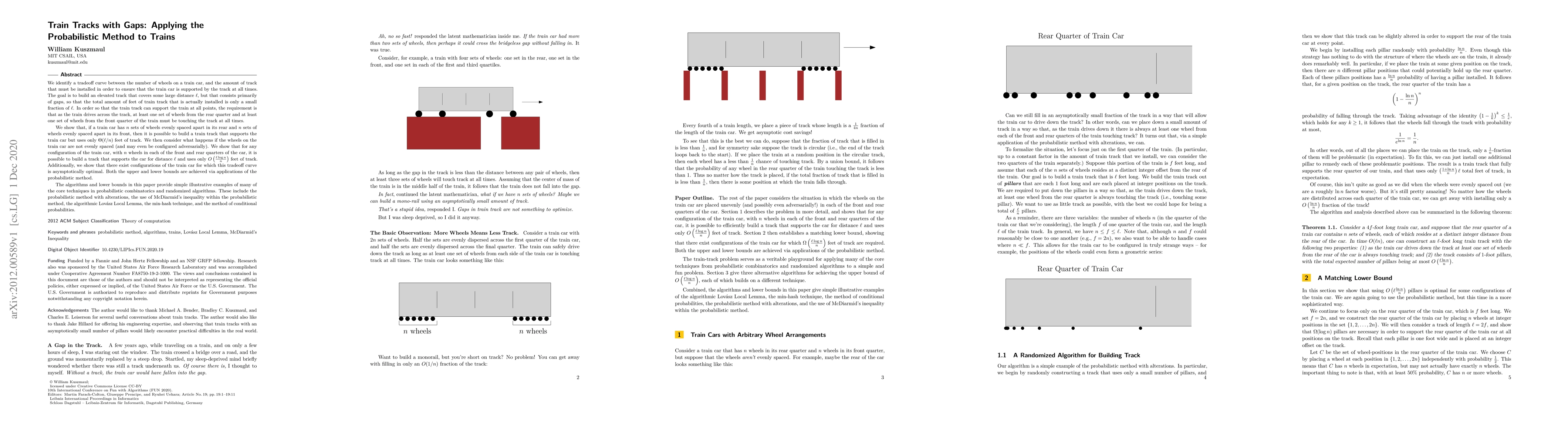 We identify a tradeoff curve between the number of wheels on a train car, and the amount of track that must be installed in order to ensure that the train car is supported by the track at all times. The goal is to build an elevated track that covers some large distance $\ell$, but that consists primarily of gaps, so that the total amount of feet of train track that is actually installed is only a small fraction of $\ell$. In order so that the train track can support the train at all points, the requirement is that as the train drives across the track, at least one set of wheels from the rear quarter and at least one set of wheels from the front quarter of the train must be touching the track at all times. We show that, if a train car has $n$ sets of wheels evenly spaced apart in its rear and $n$ sets of wheels evenly spaced apart in its front, then it is possible to build a train track that supports the train car but uses only $\Theta( \ell / n )$ feet of track. We then consider what happens if the wheels on the train car are not evenly spaced (and may even be configured adversarially). We show that for any configuration of the train car, with $n$ wheels in each of the front and rear quarters of the car, it is possible to build a track that supports the car for distance $\ell$ and uses only $O\left(\frac{\ell \log n}{n}\right)$ feet of track. Additionally, we show that there exist configurations of the train car for which this tradeoff curve is asymptotically optimal. Both the upper and lower bounds are achieved via applications of the probabilistic method.