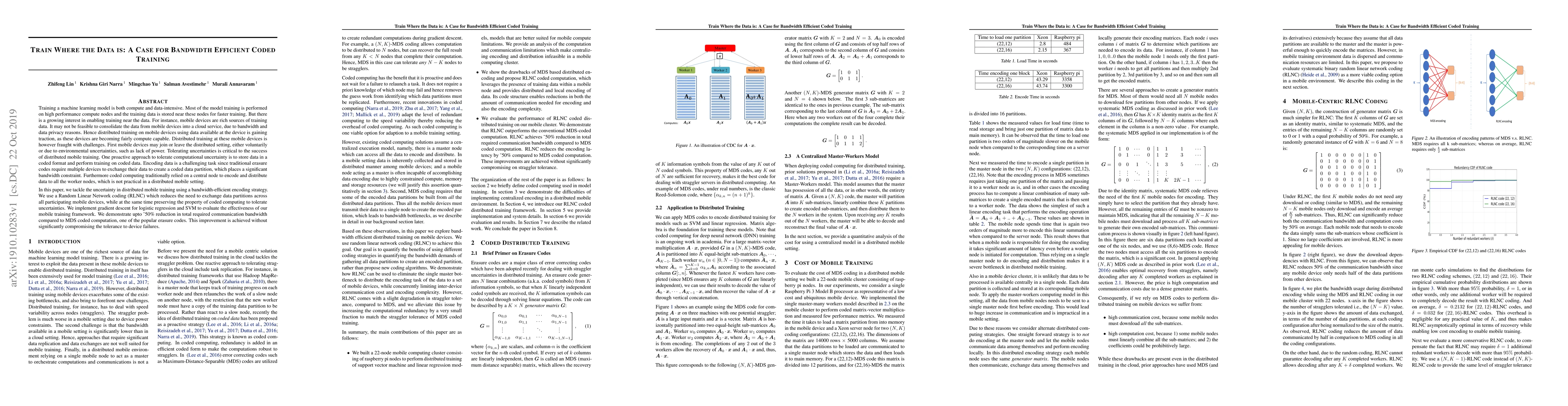 Training a machine learning model is both compute and data-intensive. Most of the model training is performed on high performance compute nodes and the training data is stored near these nodes for faster training. But there is a growing interest in enabling training near the data. For instance, mobile devices are rich sources of training data. It may not be feasible to consolidate the data from mobile devices into a cloud service, due to bandwidth and data privacy reasons. Training at mobile devices is however fraught with challenges. First mobile devices may join or leave the distributed setting, either voluntarily or due to environmental uncertainties, such as lack of power. Tolerating uncertainties is critical to the success of distributed mobile training. One proactive approach to tolerate computational uncertainty is to store data in a coded format and perform training on coded data. Encoding data is a challenging task since erasure codes require multiple devices to exchange their data to create a coded data partition, which places a significant bandwidth constraint. Furthermore, coded computing traditionally relied on a central node to encode and distribute data to all the worker nodes, which is not practical in a distributed mobile setting. In this paper, we tackle the uncertainty in distributed mobile training using a bandwidth-efficient encoding strategy. We use a Random Linear Network coding (RLNC) which reduces the need to exchange data partitions across all participating mobile devices, while at the same time preserving the property of coded computing to tolerate uncertainties. We implement gradient descent for logistic regression and SVM to evaluate the effectiveness of our mobile training framework. We demonstrate a 50% reduction in total required communication bandwidth compared to MDS coded computation, one of the popular erasure codes.