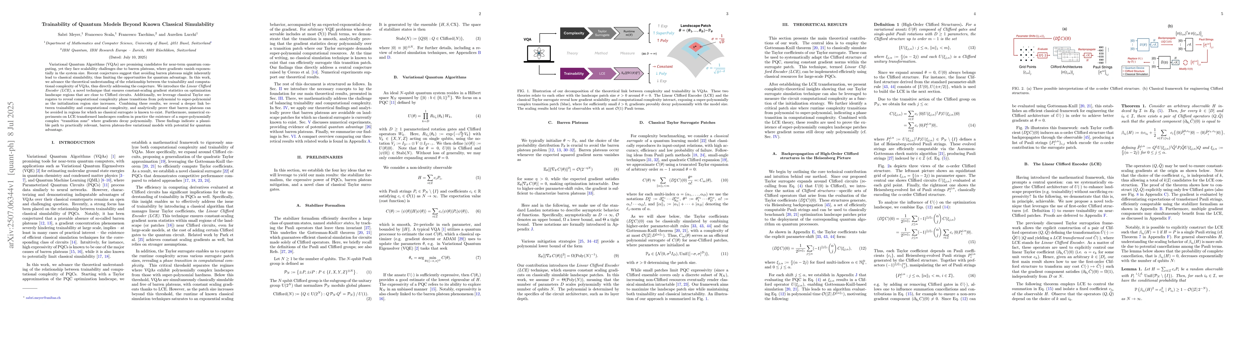 Variational Quantum Algorithms (VQAs) are promising candidates for near-term quantum computing, yet they face scalability challenges due to barren plateaus, where gradients vanish exponentially in the system size. Recent conjectures suggest that avoiding barren plateaus might inherently lead to classical simulability, thus limiting the opportunities for quantum advantage. In this work, we advance the theoretical understanding of the relationship between the trainability and computational complexity of VQAs, thus directly addressing the conjecture. We introduce the Linear Clifford Encoder (LCE), a novel technique that ensures constant-scaling gradient statistics on optimization landscape regions that are close to Clifford circuits. Additionally, we leverage classical Taylor surrogates to reveal computational complexity phase transitions from polynomial to super-polynomial as the initialization region size increases. Combining these results, we reveal a deeper link between trainability and computational complexity, and analytically prove that barren plateaus can be avoided in regions for which no classical surrogate is known to exist. Furthermore, numerical experiments on LCE transformed landscapes confirm in practice the existence of a super-polynomially complex ``transition zone'' where gradients decay polynomially. These findings indicate a plausible path to practically relevant, barren plateau-free variational models with potential for quantum advantage.