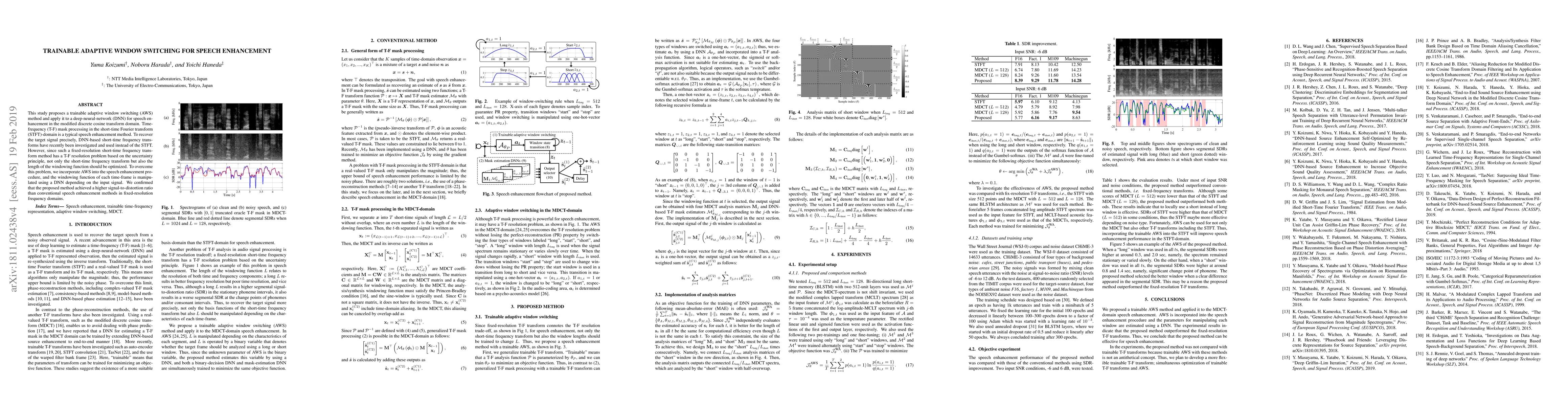 This study introduces a trainable adaptive window switching (AWS) method applied to deep neural networks for speech enhancement, optimizing both the short-time frequency transform and windowing function length. The proposed method achieves a higher signal-to-distortion ratio compared to conventional fixed-resolution methods.