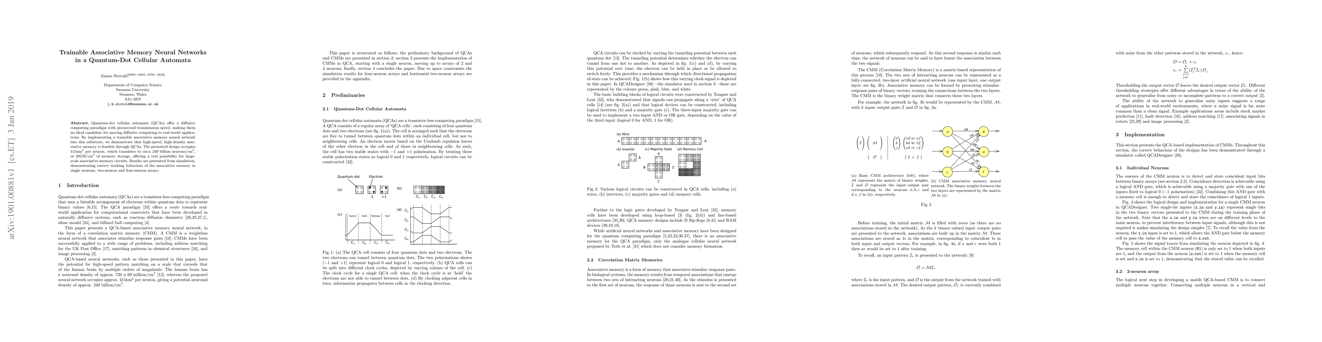 Quantum-dot cellular automata (QCAs) offer a diffusive computing paradigm with picosecond transmission speed, making them an ideal candidate for moving diffusive computing to real-world applications. By implementing a trainable associative memory neural network into this substrate, we demonstrate that high-speed, high-density associative memory is feasible through QCAs. The presented design occupies $415\text{nm}^2$ per neuron, which translates to circa $240 \text{ billion neurons/cm}^2$, or $28\text{GB/cm}^2$ of memory storage, offering a real possibility for large-scale associative memory circuits. Results are presented from simulation, demonstrating correct working behaviour of the associative memory in single neurons, two-neuron and four-neuron arrays.