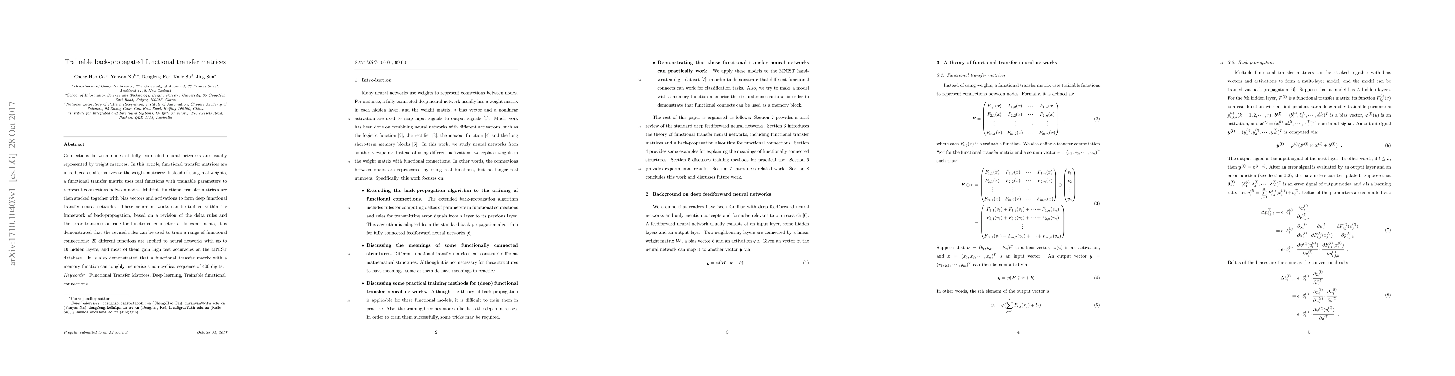 This paper introduces functional transfer matrices as an alternative to traditional weight matrices in neural networks, using real functions with trainable parameters to represent node connections. These matrices enable the formation of deep functional transfer neural networks that can be trained via back-propagation, achieving high test accuracies on the MNIST dataset and demonstrating the ability to memorise sequences of digits.