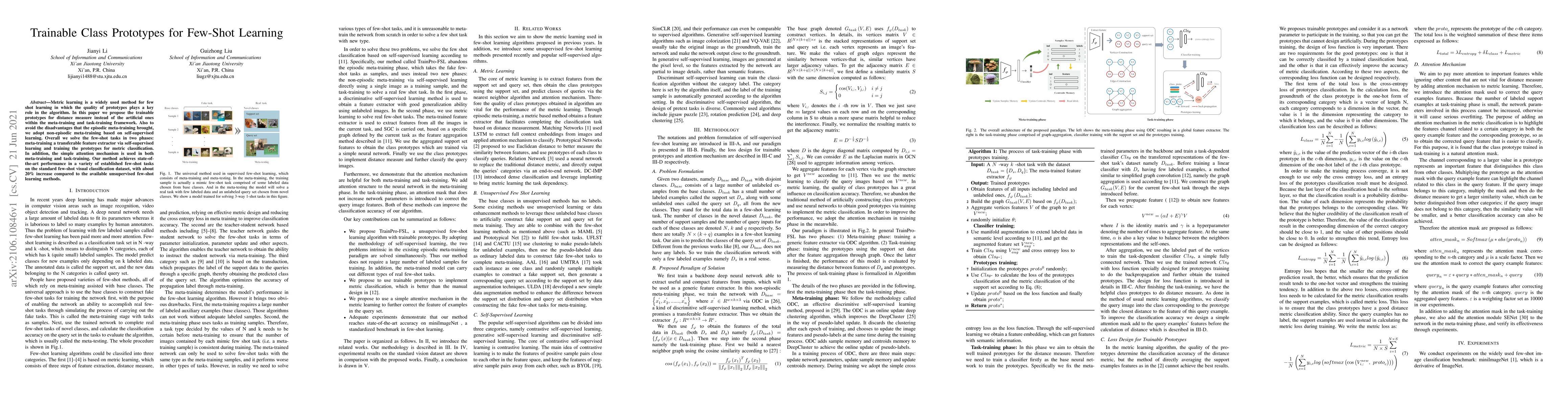 Metric learning is a widely used method for few shot learning in which the quality of prototypes plays a key role in the algorithm. In this paper we propose the trainable prototypes for distance measure instead of the artificial ones within the meta-training and task-training framework. Also to avoid the disadvantages that the episodic meta-training brought, we adopt non-episodic meta-training based on self-supervised learning. Overall we solve the few-shot tasks in two phases: meta-training a transferable feature extractor via self-supervised learning and training the prototypes for metric classification. In addition, the simple attention mechanism is used in both meta-training and task-training. Our method achieves state-of-the-art performance in a variety of established few-shot tasks on the standard few-shot visual classification dataset, with about 20% increase compared to the available unsupervised few-shot learning methods.