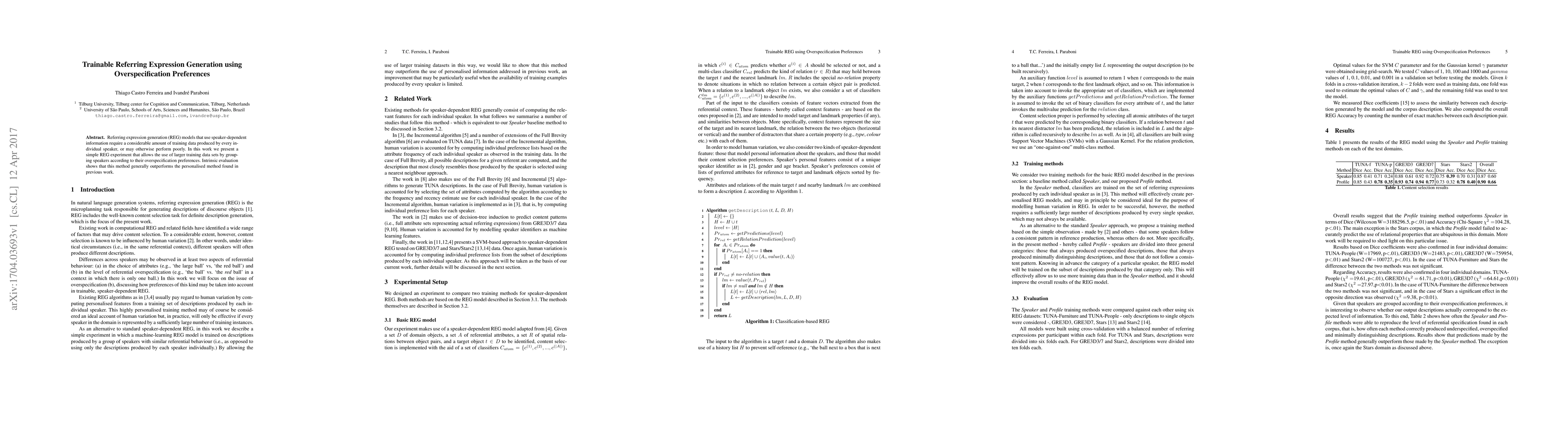 This paper proposes a trainable referring expression generation model that leverages overspecification preferences to group speakers, enabling larger training datasets and outperforming personalized methods in intrinsic evaluation.