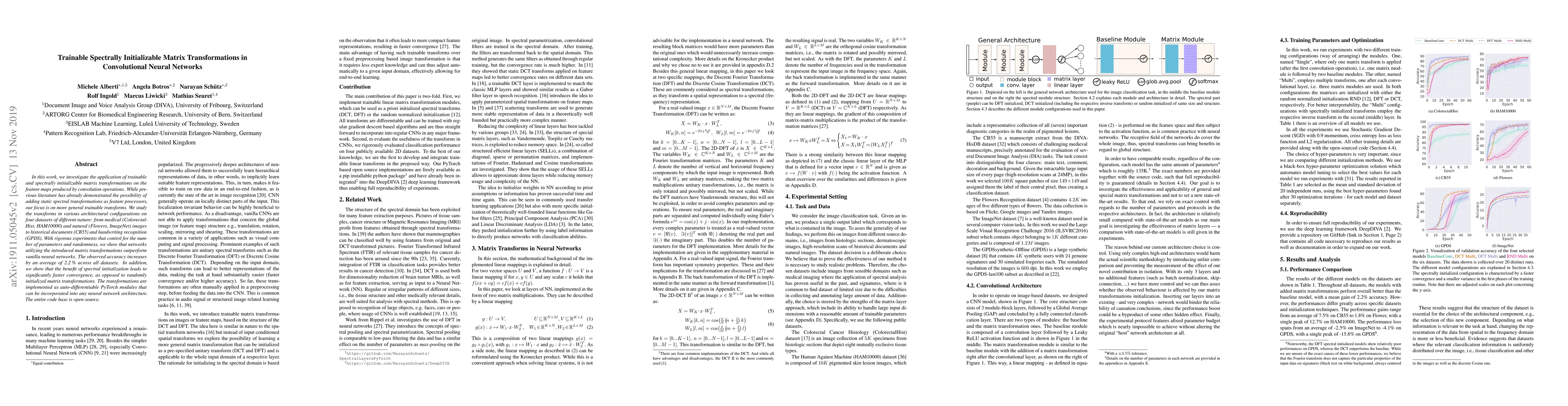 This paper explores trainable and spectrally initializable matrix transformations in convolutional neural networks, demonstrating improved performance and faster convergence across diverse datasets. The proposed transformations outperform vanilla networks, achieving an average accuracy increase of 2.2%.